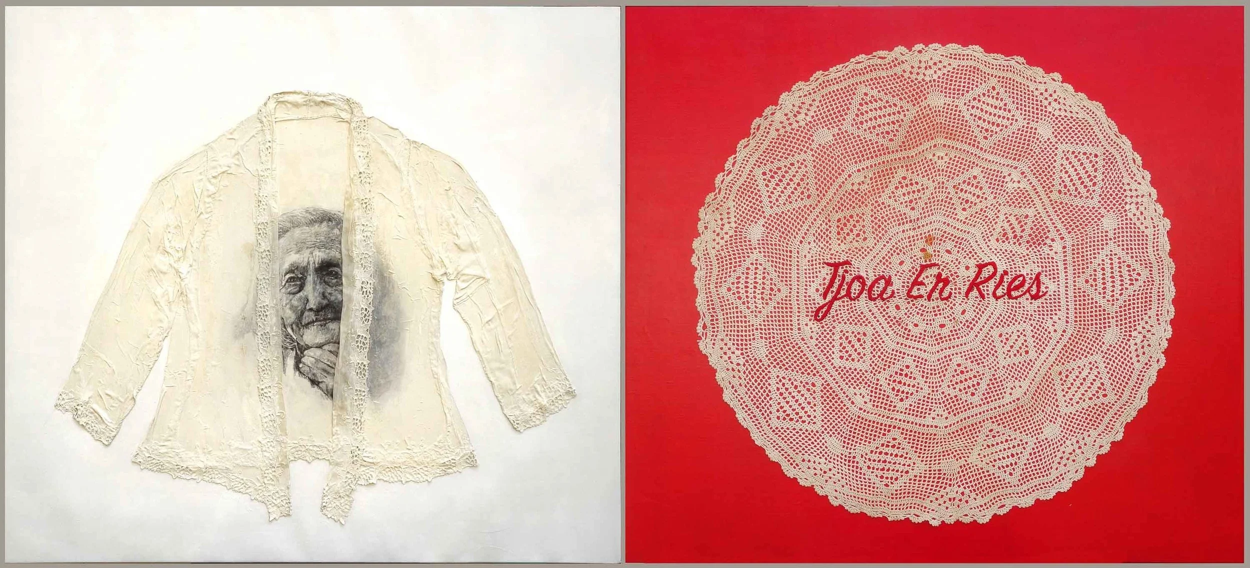 FX Harsono, NAMA from the Last Survivor / NAMA Dari Penyintas Terakhir, 2019, collage, hand embroidery, crochet on tablecloth on canvas, pencil drawing and acrylic on kebaya encim blouse on canvas, 2 pieces 105 x 115 cm each. Image courtesy of the artist and Tyler Rollins Fine Art.