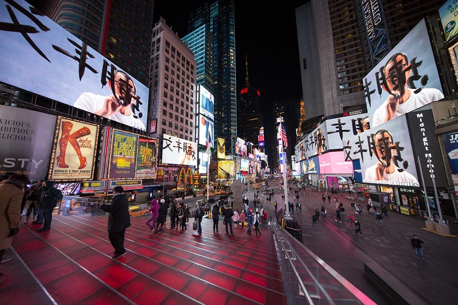 Installation view of Writing in the Rain featured in Times Square, NY for Midnight Moment, January 1 - 31, 2018. Image courtesy of the artist and Tyler Rollins Fine Art.