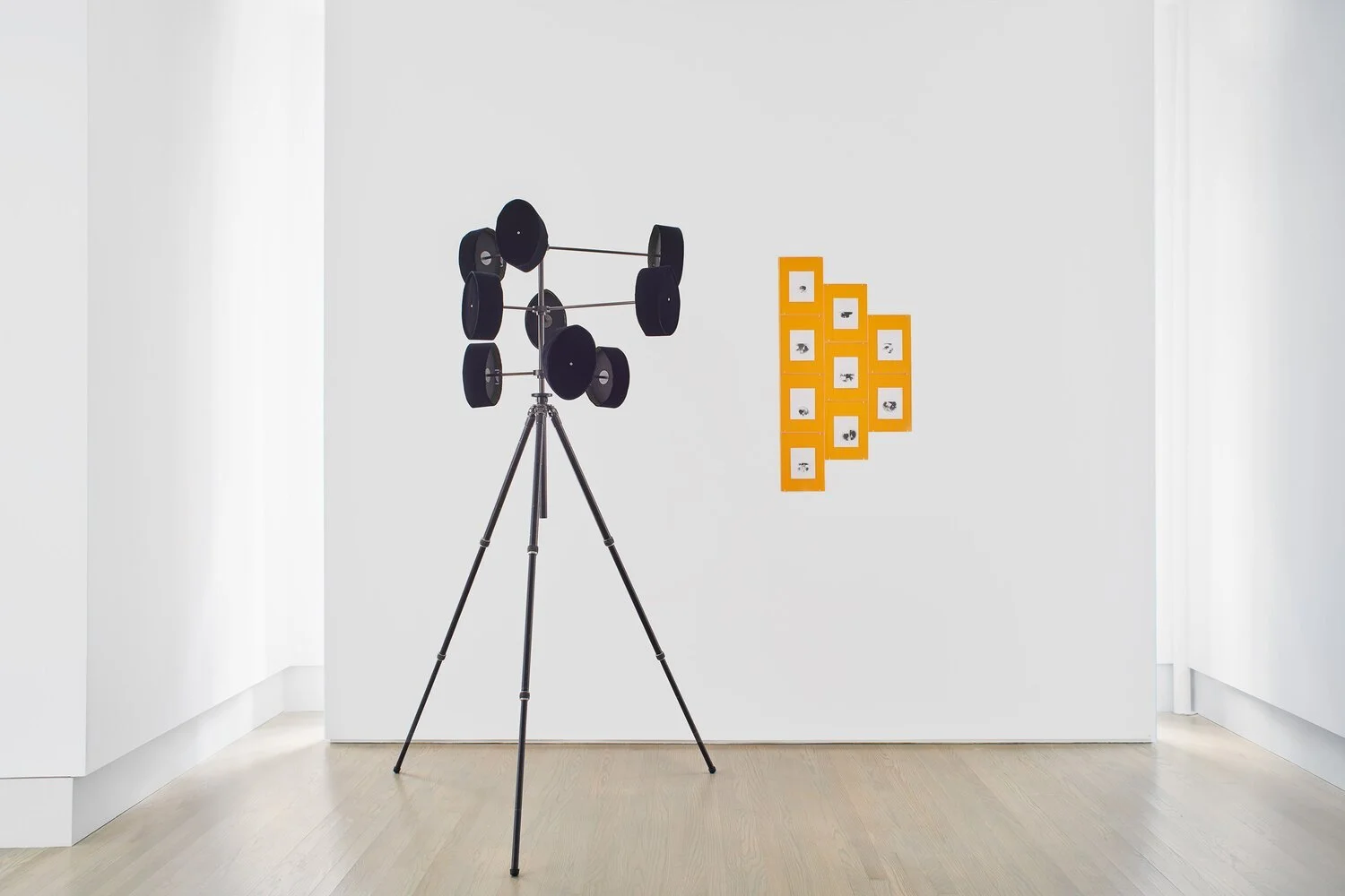 Widjaja's newest work, 九百九十九朵玫瑰 (Nine Hundred and Ninety-Nine Roses), is an installation comprising nine black pecis mounted atop a multi-directional tripod. The peci is a headdress commonly worn by Muslim men across Southeast Asia, which became a symbol of Indonesian national identity after it was popularised by Sukarno. In this work, the peci functions as both a signifier of nationhood and an image producer. Widjaja modified the headdresses into a pinhole camera to produce nine photographs of Sukarno's diplomatic meetings, that accompany the installation. Viewed from a distance, the free-standing structure mimics an outdoor megaphone, used to disseminate public warnings. It calls for the audience to pause and contemplate the construction of such mass media images.