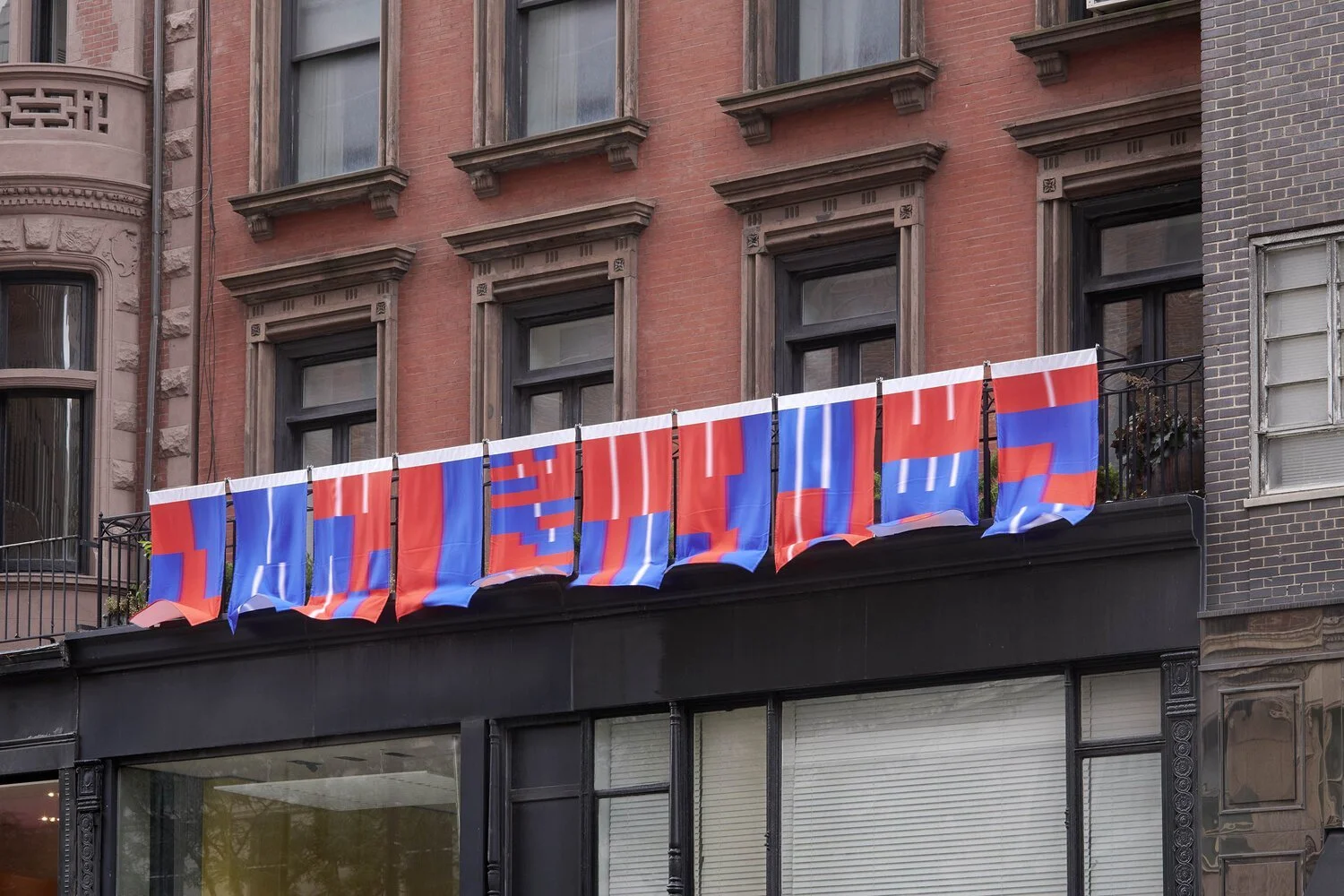 Photo documentation of outdoor installation at Helwaser Gallery, New York, showing Art is only a continuation of war by other means (flags), 2019. Image courtesy of Helwaser Gallery. © Boedi Widjaja. Photography by Phoebe d'Heurle.
