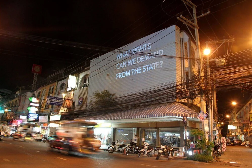 Piyapongwiwat’s text-based video work, Messages From Nowhere to Nowhere, utilises the culturally diasporic backdrop of Pattaya City, Thailand to examine common threads of discontent with local government shared by its diverse residents. These collected messages, gathered from private conversations, are projected into the public sphere, onto walls in busy urban spaces in and around Pattaya City, thus creating opportunities for the community to cross lines of culture, language, and social taboo to discuss ways in which they believe their government has failed them.