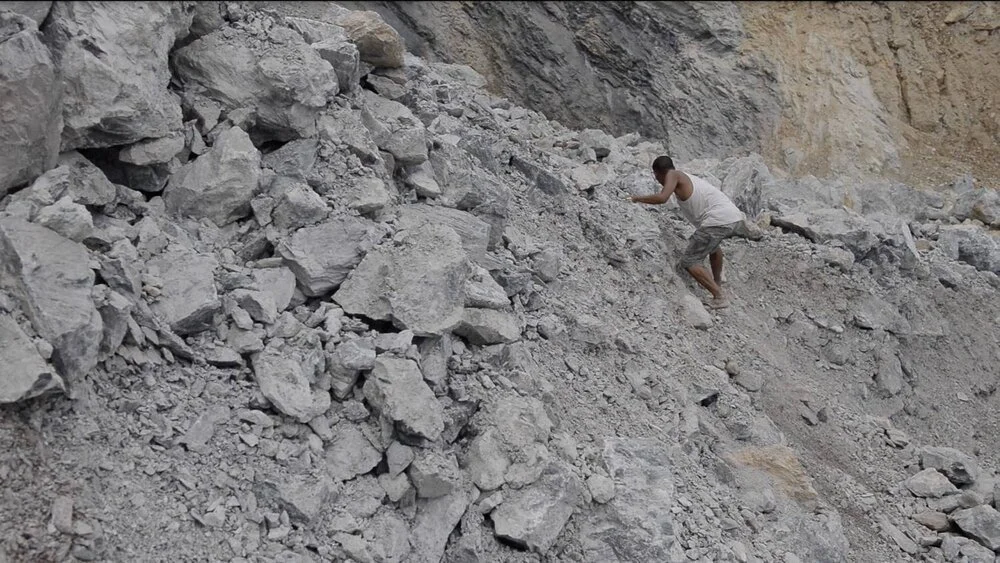Documentary elements are used again in Piyapongwiwat’s recent video work, Particle (2019), but augmented by a fictive narrative that is interwoven throughout. Here she also examines industrial exploitation, but focuses on the effect of extractive capitalism on a community in Cambodia. This community has been fenced off from the mountain they have relied on for generations to provide them with food, medicine, and money, so that the limestone can be extracted for use in urban development by the Cambodian-Thai owned Kampot Cement Company. By connecting the audience through intimate interviews with these villagers and laborers, Piyapongwiwat amplifies the voices of the marginalised.