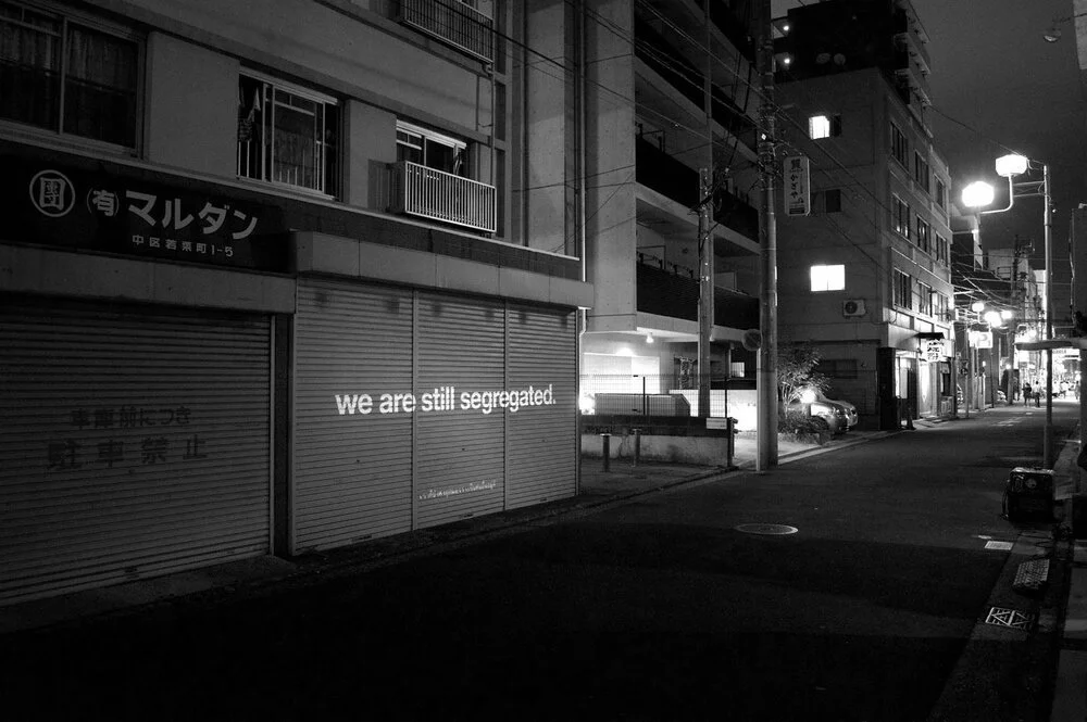 In her 2016 work, Mute Conversations, Piyapongwiwat employs a similar form to give public space for private dialogues gathered from conversations with Thai immigrants living in Yokohama, Japan. Once again, by projecting these statements along well-trafficked pedestrian routes in Yokohama, she publicly confronts communities with the unguarded honesty that is normally reserved for intimate conversations among friends, and in doing so, she creates a bridge between members of this community who might not otherwise achieve such uninhibited dialogue.