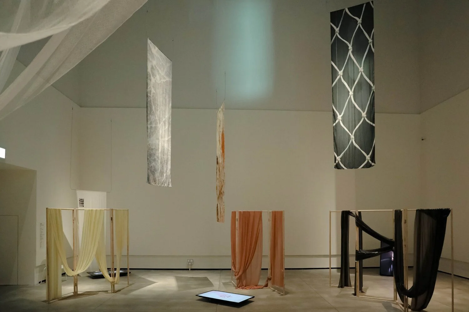 Weixin Chong, sft crsh ctrl, 2018-19, video, prints on silk twill and latex partitioning screens. Exhibition installation view in SUPER-TRAJECTORY at Tainan Art Museum. Image courtesy of Tainan Art Museum.