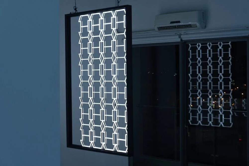 Amid yet more wall-mounted neon and LED text pieces, a sculpture by Ly Hoàng Ly stood out on account of its non-reliance on the written word. Priced at USD7,000 and titled boat-home- boat (part of the ongoing series 0395A.DC, initiated in 2011), the work resembles the grilles placed over windows to stop burglars, except that instead of metal, this grille is made from LED lights, with a decorative pattern of interlocking boats and houses. Hanging perpendicular to the wall, it becomes an architectural fragment floating free from its moorings, suggesting permeability instead of security, and encapsulating the spirit of the show as a whole: a flickering existence in a state of eternal flux.