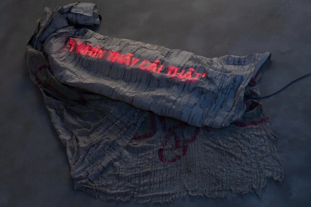Since government support for contemporary art in Vietnam is practically non-existent, Sàn Art has sporadically used fund-raising exhibitions to finance their programming, and so the exhibition Điềm Mờ (Opaque Signs) was conceived as a fundraiser in which artists who have collaborated with Sàn Art in the past were invited to donate artworks, or concepts for artworks, for which Sàn Art would pay the fabrication costs. The show is co-curated by the Sàn Art team, made up of the designer Nhật Q. Võ, the writer Nguyễn Hoàng Quyên, and the curators Vicky Đỗ and Mary Lou David. Interestingly, it features only light-based installations: a medium chosen for its ubiquity within the Vietnamese landscape, where LEDs and neon lights are frequently used in commerce, religion and government propaganda.