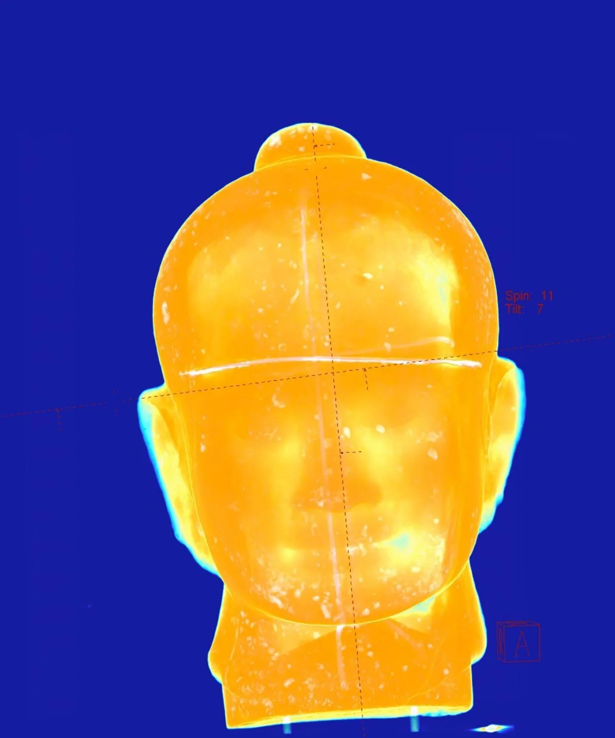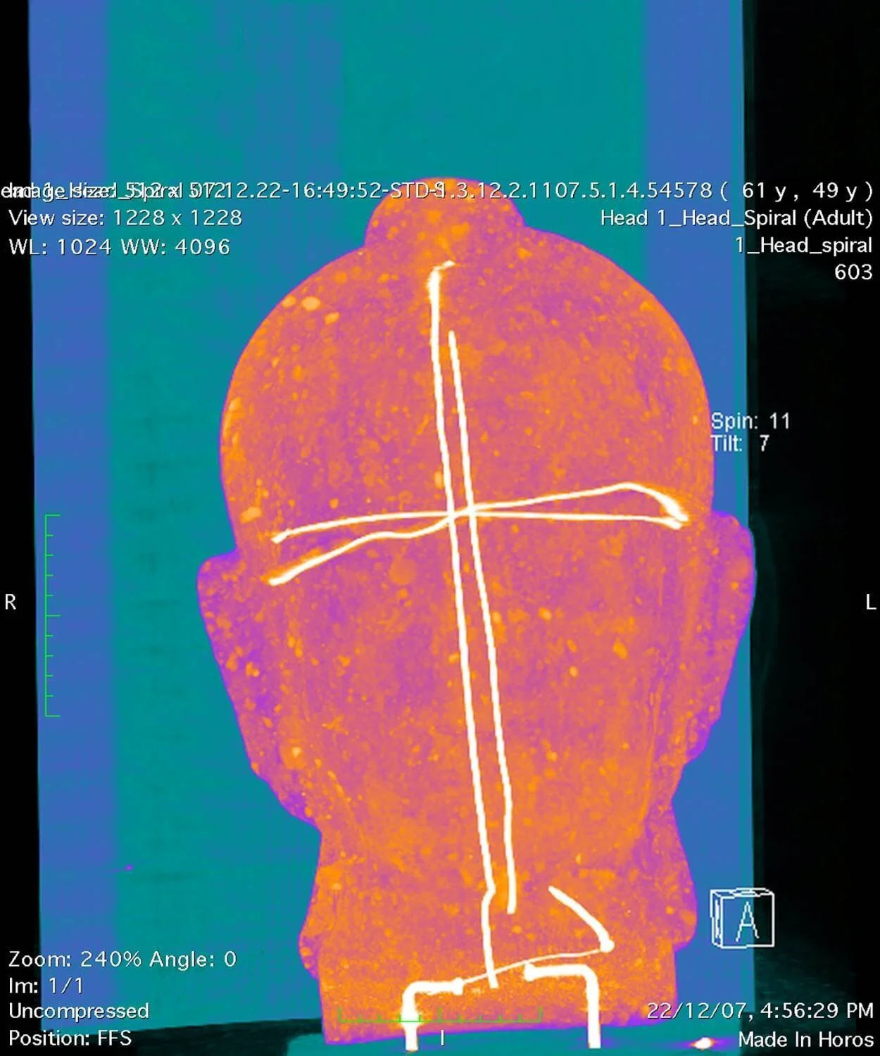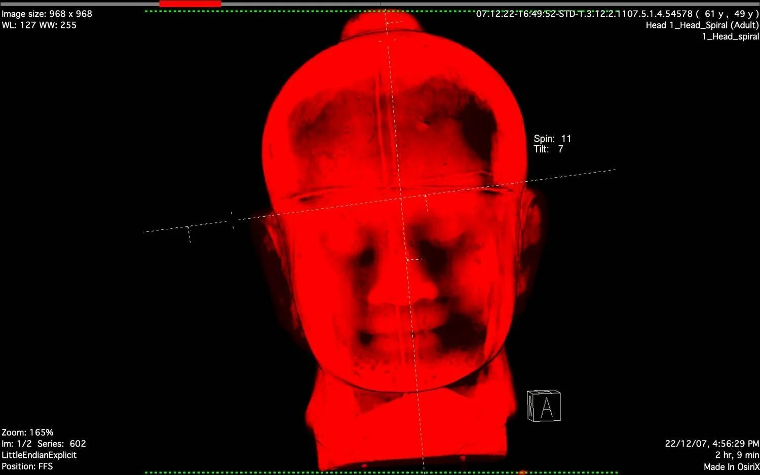 Guillaume chose to not to open the gift in front of his friends, according to Japanese tradition, and continued to keep it wrapped after they had left. But six months later, his curiosity got the better of him. Instead of opening it up however, he brought it to the hospital. “I felt a bit guilty about being rude to my friends,” says Guillaume. “I carried all 15kg of it to the hospital. I got it scanned. First I saw the head I was expecting to see. For me, it’s the most serene face you’ve ever seen. It was like having my cake and eating it because it is still packed.” This was the beginning of Guillaume’s artistic intervention.
