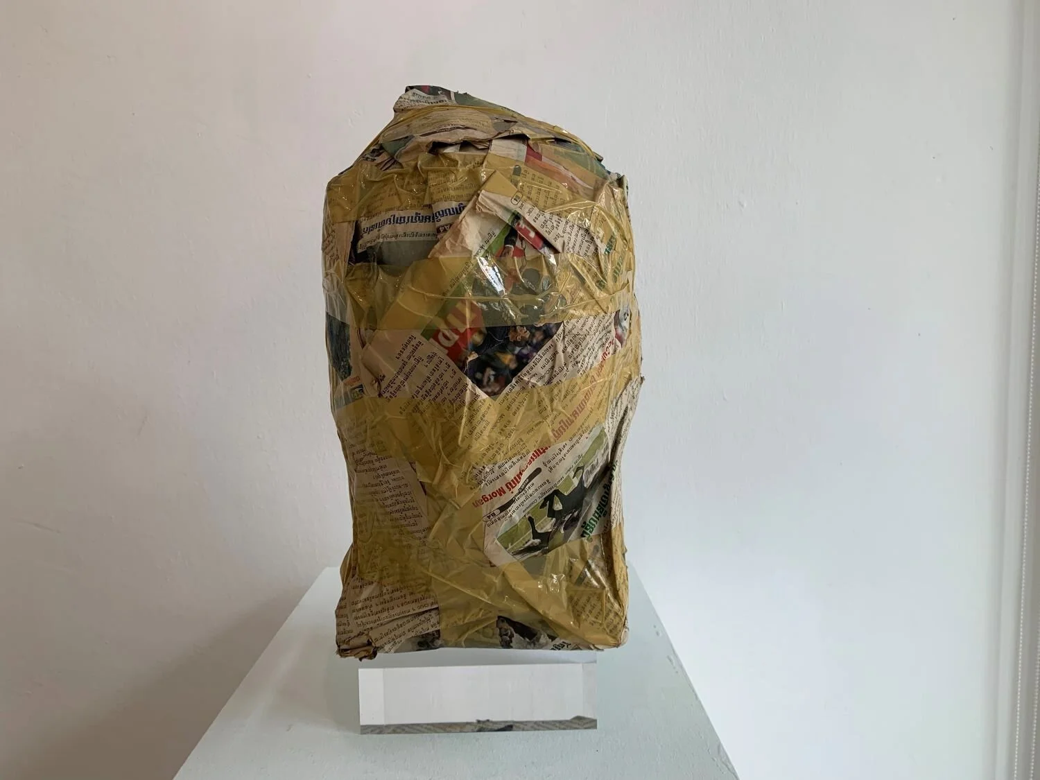Guillaume Levy-Lambert, Homage to Christo (part one), 2019, cambodian newspaper, scotch tape, mysterious gift, 60 x 35 x 40cm (approximately). Image courtesy of Art Porters.