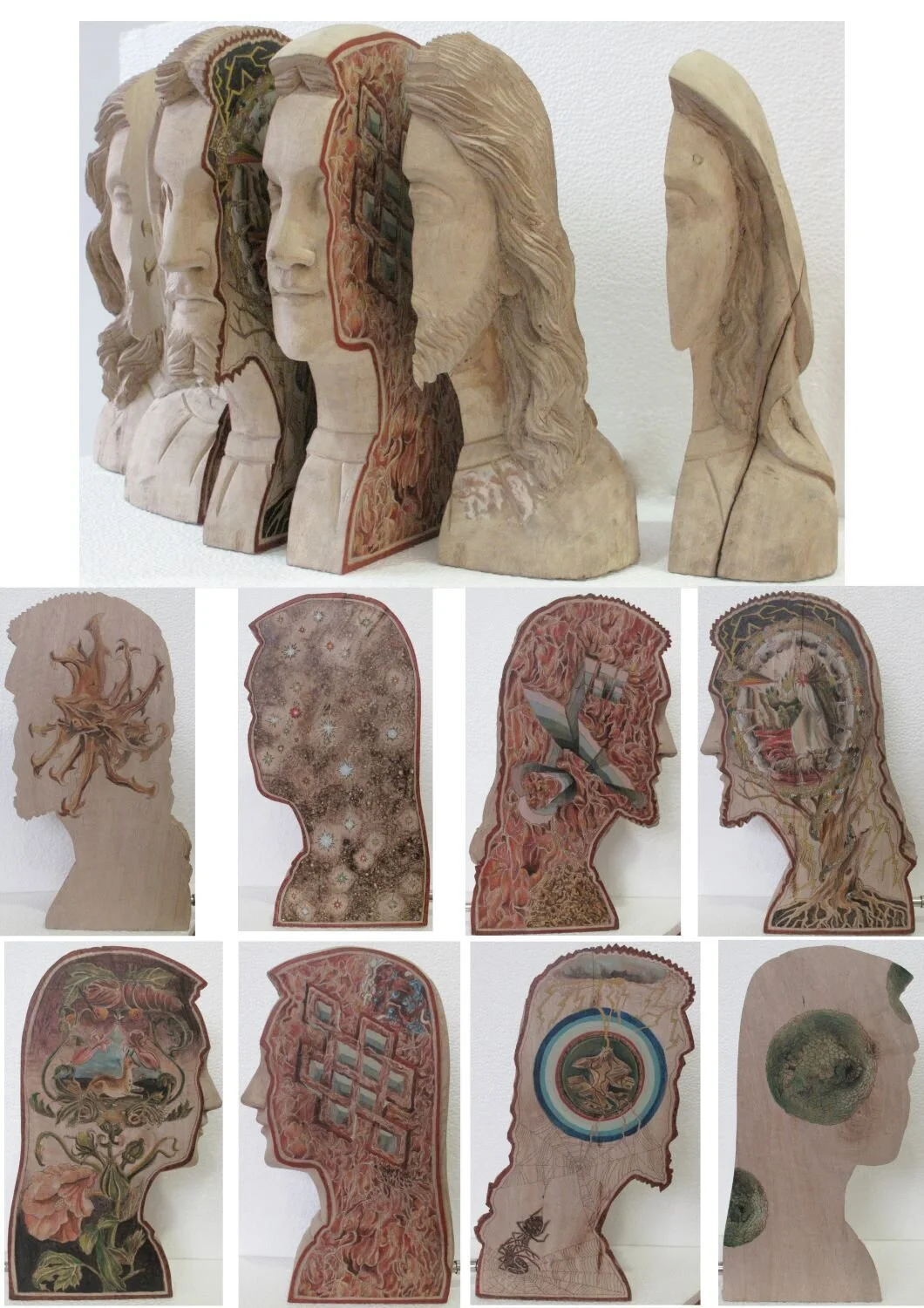 Mariano Ching, Heads, 2011, pyrograph, acrylic and wood, 48.5 x 89 x 38.5cm. Image courtesy of Art Outreach.