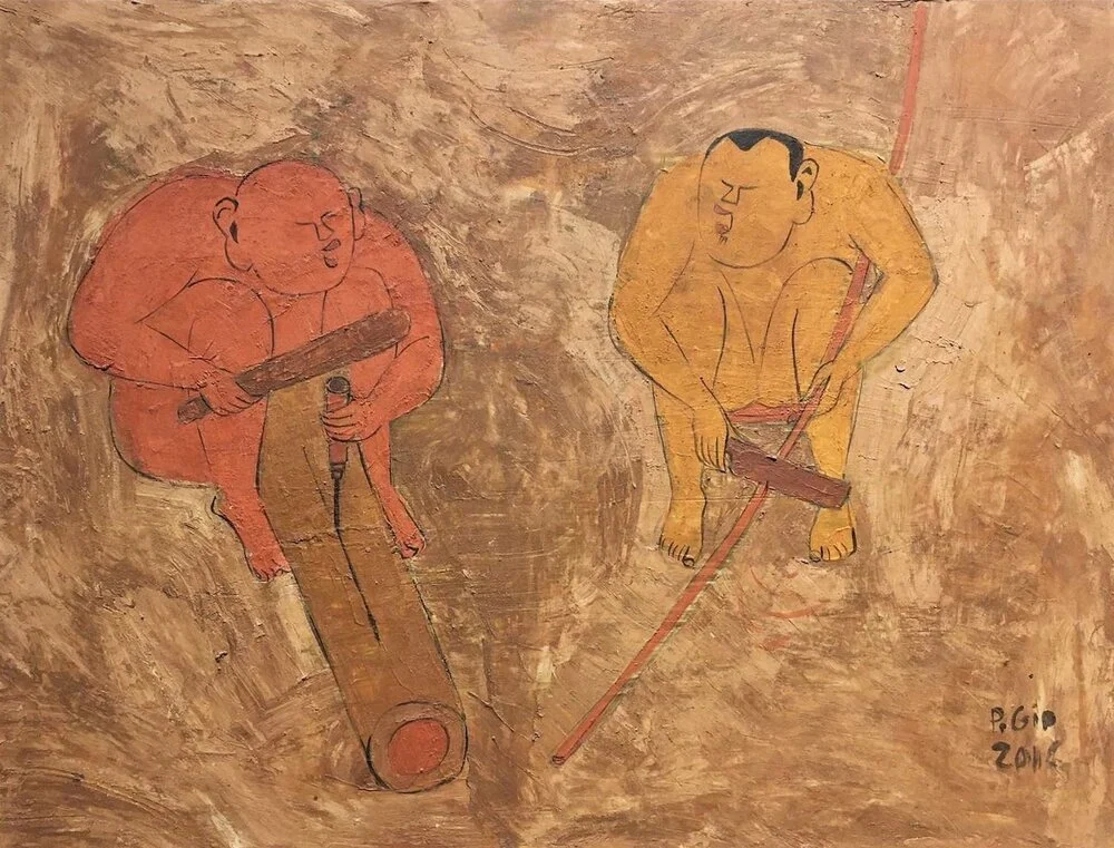 Phuong’s paintings are the result of many years of hard work, ever since he discovered that dirt could be used as a source of colour. When looking through his body of work, it is easy to see different styles, moving from pieces of work from 2012, with a dark matte texture and monotones to Đàn Đó 52 created three years later, where reds and yellows jump from the canvas through considered brush strokes. There are three main types of dirt used in the painting: alluvial, clay and powdered dirt, including mineral rock, as well as a special black colour that is made from burned dried bamboo leaves.