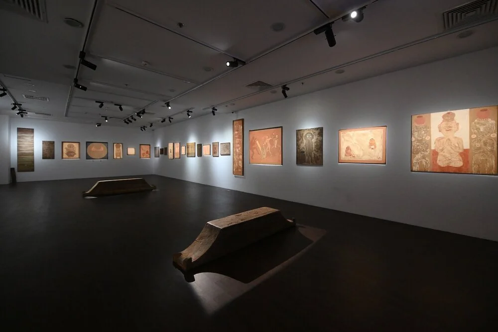 By travelling across the country to conduct research, Phuong found that dirt became indicative of people and places. In the mountains of Tuyen Quang, he came across priests of the Tay ethnic group who also use dirt to draw pictures of rituals on paper. The priests explained that types of glue could be made from tree sap. Back home, he used what he had learned to mix resin with his paints and create his current material. Each work of art became an experiment, where the main materials stayed the same, but small ingredients would change, to create different shades and textures. Phuong finally ended up with the collection of 56 paintings that are on show in Đàn Đó’s exhibition at VCCA.