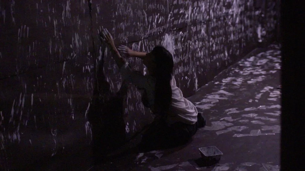 Quynh Lam's performance documentation I am not a spy speaks to the tense relationship between local Vietnamese people and those abroad. Originally staged in Knoxville, she wrote the words "I am not a spy" repeatedly on the walls of a gallery space while audiences were only able to watch her from outside or over the CCTV. The piece was based on a traumatic incident, when a Vietnamese American man accused Lam of being a communist spy and locked her in a room in his house for a night.