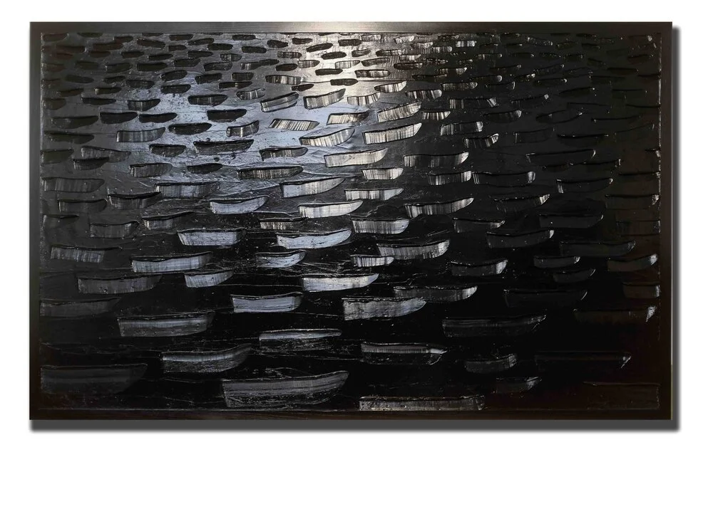 A major curatorial strand highlights artistic practices shaped by the diaspora and overseas education. Bao Vuong's black oil paintings recall works by the French master Pierre Soulages, also known as "the master of black". Indeed, Vuong's family were among the Boat People who fled Vietnam by sea and eventually settled in France. Titled 'The Crossing', this body of work references the artist's experience as a child refugee and the difficult journey taken by thousands of Vietnamese. The still surface of cool black paint is punctured by ripples that reflect light. More than just a formalist exercise, Vuong's treatment of the monochrome is imbued with biographical significance and fraught social histories.