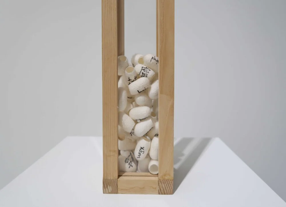 Cam Xanh, Declaration of Independence of Vietnam (detail), 2015, marker on silkworm cocoons in plexiglass case, 50 x 10 x 10cm. Image courtesy of the artist and Richard Koh Fine Art.