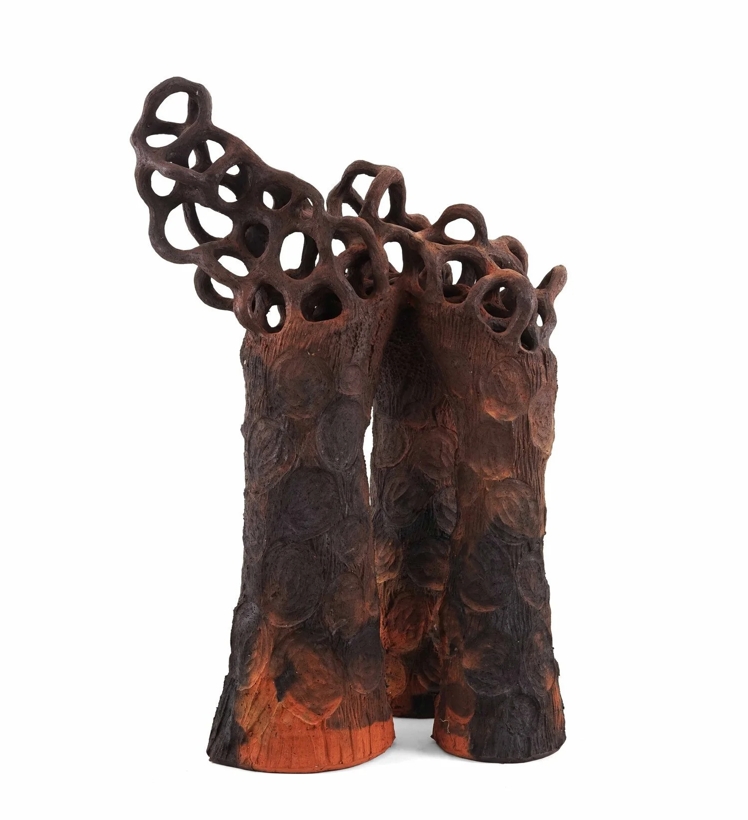 Importantly, there is mutual learning and transfer of skills in the collaboration process. During his residency at YAL, veteran performance artist and ceramist Jason Lim passed on his knowledge of building brick kilns for a sawdust firing technique. His pieces speak most profoundly to the exhibition title Navigating Entropy in its embrace of the unpredictable firing process and the fragile beauty of earthenware.