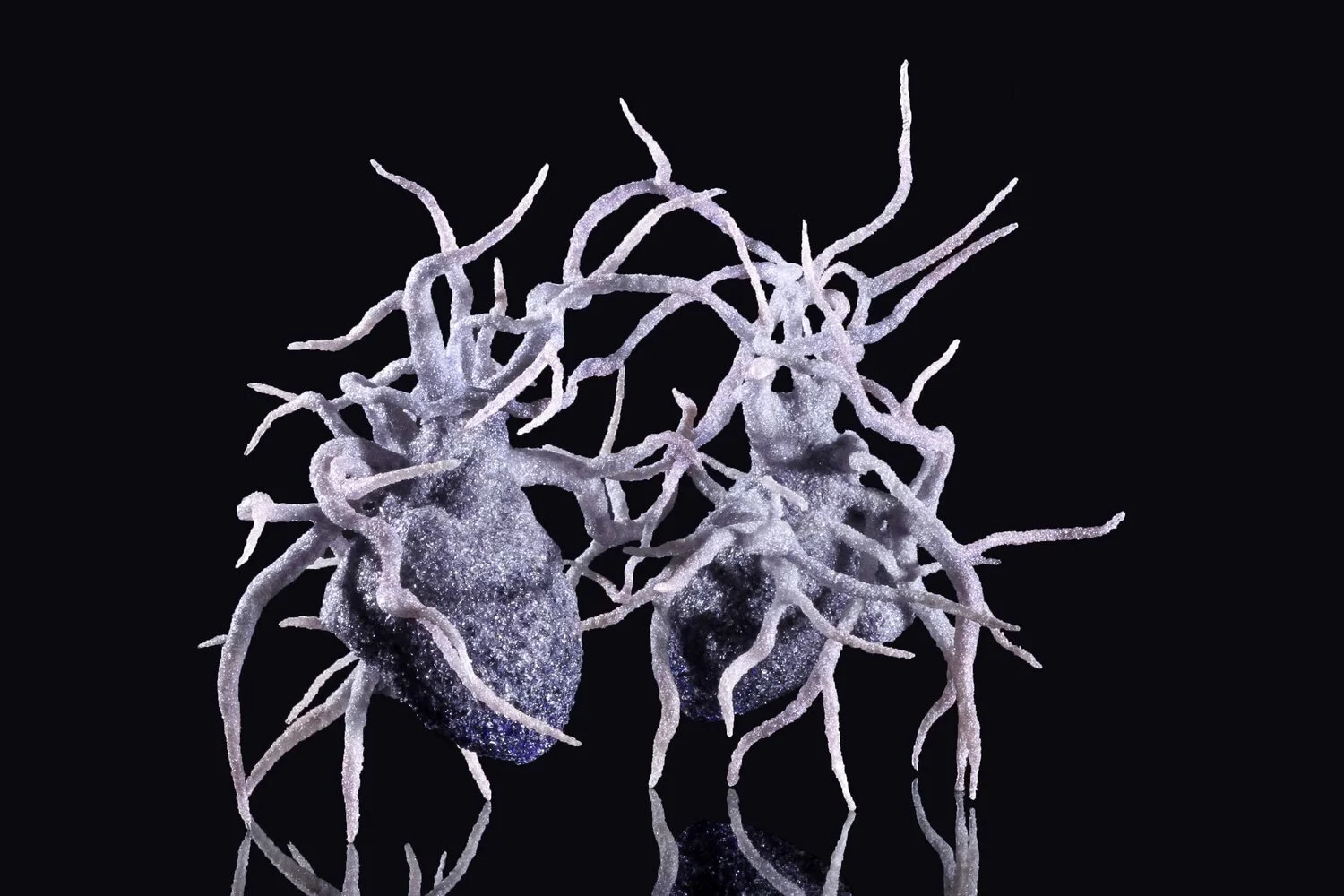 This theme of strength and fragility is carried through in Suzann Victor's crushed stained glass sculptures which take the form of wings, hearts and religious icons. For Victor, the collaboration was an opportunity to revisit a seminal work presented in the 2nd Asia Pacific Triennial of Contemporary Art in Brisbane in 1996. Titled Tintoretto’s Risen Christ Arresting Lazy Susan, the installation features parts of the female anatomy encrusted in crushed glass which has become a signature material.