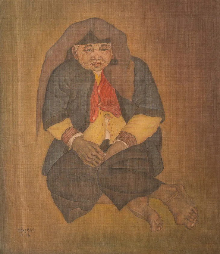 Being a mother and a Vietnamese woman allowed Mong Bich to empathise with her subjects, who tend towards women of an older age, working class or ethic minorities. Viewers can easily identify individual characters in her evocative portraits. This affective quality is recognised by some members of the local arts community. In 1997, Mong Bich won the first prize in the Vietnam Fine Arts Association's annual competition for her silk painting Bà Già (1993).