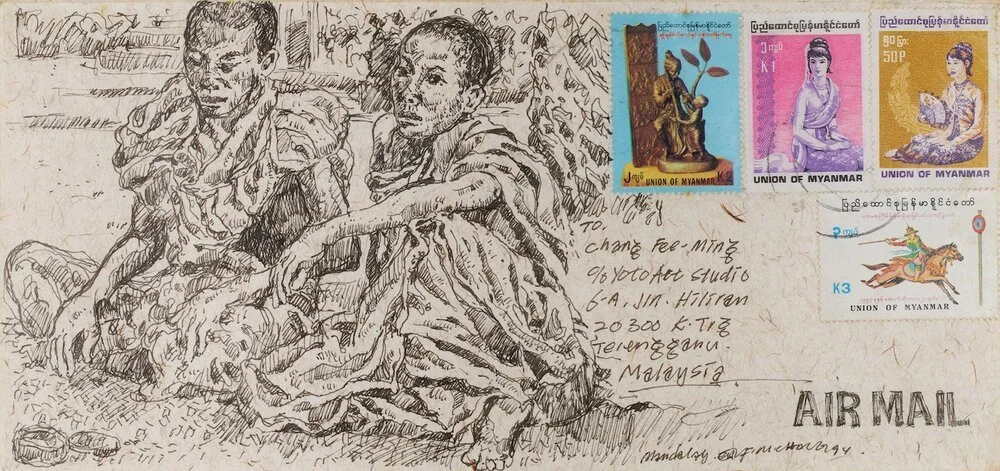 Chang Fee Ming, Novice Monks (Mandalay, Myanmar), 1994, ink on stamped envelope, 11 x 23.5cm. Image courtesy of The Private Museum.
