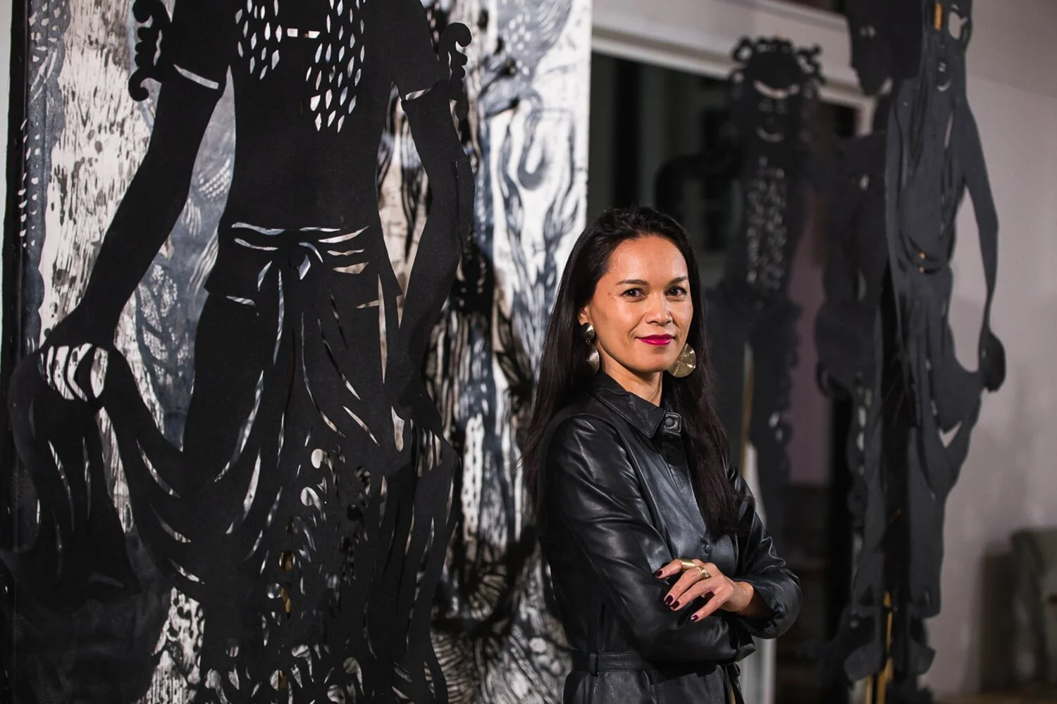 Curator Sadiah Boonstra in front of Samuel Indratma's works Putri Penunggu Pohon (2018) and Dewa and Dewi Penunggu Pohon (2019-2020). Image courtesy of Framer Framed, photograph by Maarten Nauw.