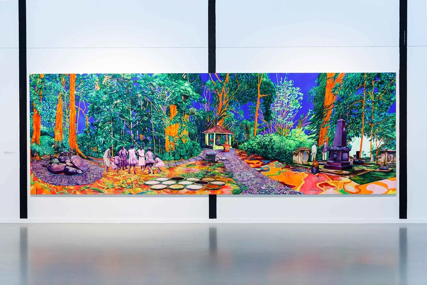 The show is centred around Walter Mignolo's concept of "decoloniality" which calls for a reconnection to modes of thinking and living before colonialism. What this entails is a critical politicisation of how knowledge is established and whose perspectives are valued. Zico Albaiquni subverts the Dutch colonial gaze by co-opting imagery from Mooi Indië painting and layering it with narratives from different cultures and histories. His monumental painting Ruwatan Tanah Air Beta, Reciting Rites in its Sites depicts the pavilion inside Kebun Raya Bogor (National Botanical Garden Bogor) where the artist attended a traditional Sudanese cleansing ritual called ruwatan. By inserting references to the stone statue of Hindi deity Nandi and flat baskets of rice which is commonly used in ruwatan, Zico conceives the painting as a cleansing ritual which shifts the viewer's perspective towards Sudanese cultural traditions.