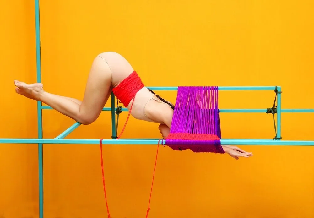 This alienation or estrangement from acting in accordance with one’s own will is illuminated by Marx’s concept of the alienation of labour. In his essay Estranged Labour, Marx suggests that labour that requires alienation of the self “mortifies [the labourer’s] body and ruins his mind,”¹ and is tantamount to forced labour. Labourers are compelled to dehumanise themselves and acquiesce to becoming merely an appendage of the machine. This becomes, as Marx puts it, “a labour of self-sacrifice, of mortification.”² This is exemplified in her video work Shuttle, in which the artist is interwoven with the frame of a loom, functioning in the role of the titular shuttle. She submits herself to work that punishes the body, lunging repetitively with the twine wrapped around her waist, allowing her bones to continually grind into the metal frame that supports her, treating her body like an object, i.e. an appendage of the machine. She enacts a symbolic shedding of her humanness, and surrenders her body and identity to the repeating motions of an apparatus whose very functionality is staked in her continued subjugation.