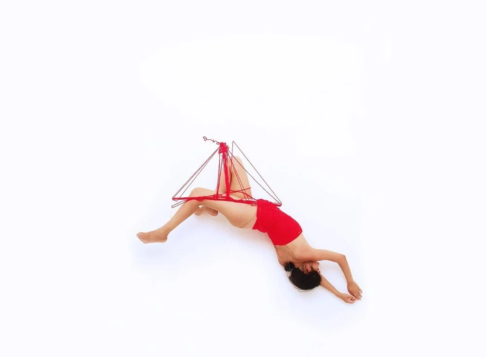 In The Spinning Wheel, she visually asserts that this bondage is not a flaw of the system, but is intrinsic to its designed purpose. In this work, she clings to a red, spinning mechanism while a length of white twine unravels itself from around her body, rotating her head-over-feet as it does so. While inhabiting this bound and precarious position, Vatanajyankur demonstrates the role of violence, overt or invisible, as a restrictive force by placing a large needle underneath the wheel. She notes that “I have to always hold tight to the wheel as it turns because if I fall out of this hamster wheel, if I fall out of this system and this cycle of repetitive work, then I know what happens.”⁶