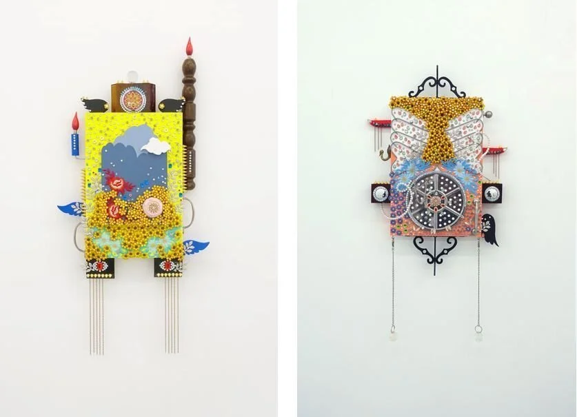 Left: Khairullah Rahim, Soap Opera, 2020, mixed media assemblage on wooden panel, panel size: 46 × 30.5cm, including assemblage: 67 × 50cm. Right: Khairullah Rahim, Eye Candy, 2020, mixed media assemblage on wooden panel, panel size: 46 × 30.5cm, including assemblage: 90 × 47cm. Image courtesy of the artist and Yavuz Gallery.