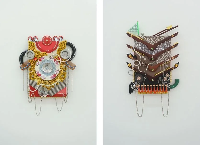 Left: Khairullah Rahim, Regular Intruder, 2020, mixed media assemblage on wooden panel, panel size: 46 x 30.5cm, including assemblage: 104 x 49cm. Right: Khairullah Rahim, In Unison, 2020, mixed media assemblage on wooden panel, panel size: 46 x 30.5cm, including assemblage: 90 x 48cm. Image courtesy of the artist and Yavuz Gallery.