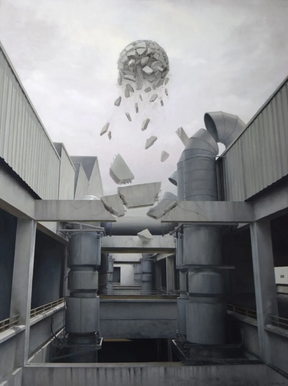 Aside from titles that point to what is natural and innately human, infrastructure forms the bulk of these artworks. Local landscapes with focal points that are universal and familiar to city dwellers. We observe them daily from our windows, looking outwards at housing blocks, roads and freeways, factories and industrial buildings. They are the blueprints of civilization, and symbolic markers of function and efficiency. One would consider that such hefty structures are built to last—“an attempt to make a self-maintaining whole configuration”—as Christopher Alexander observes. Yet, more often than not, the lives of buildings are as temporary as our own. Like the human body, their parts are similarly built up and torn down, in cycles of regulation and replacement.