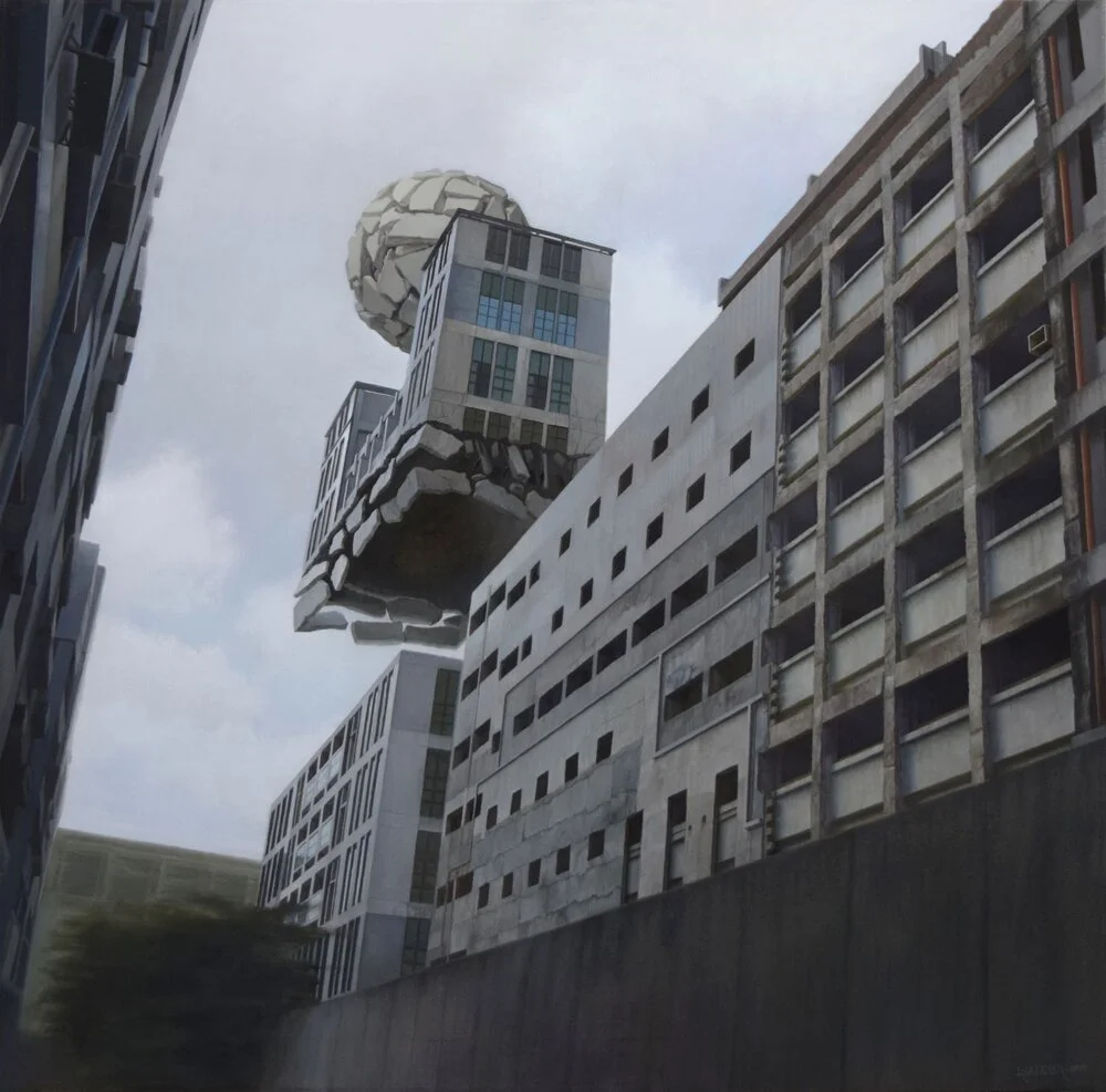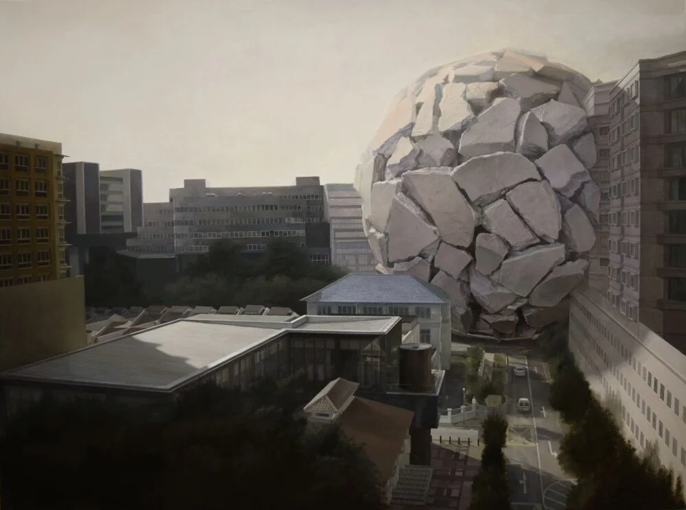 Asphyxia is a painting that catapults the burden and weight of tension into the extreme. It appears as an oversized cell or sphere in the heart of the city and a mass of destruction, threatening the structures we build up for productivity and habitation. A literal roadblock manifests as a blood clot in the vessels that supply oxygen to the heart. While the feeling of suffocation is general, we turn to Maslow’s hierarchy to remind ourselves that each person is at the mercy of different needs; and should the need for shelter be fulfilled, the need for love may be left wanting, leaving individuals at staggered levels of distress.