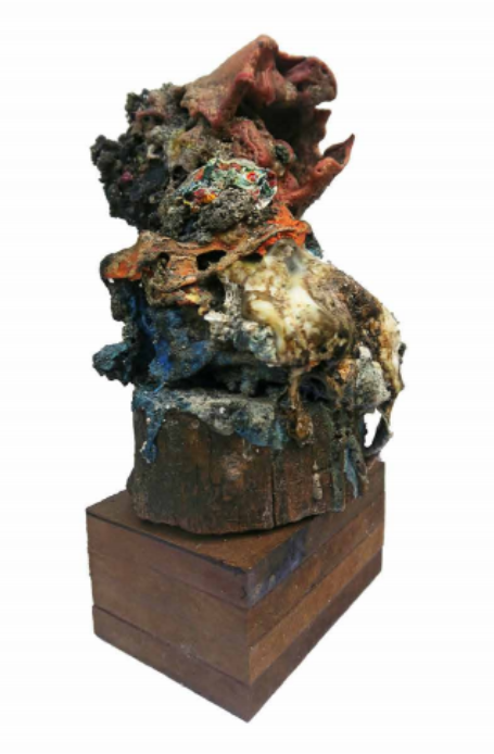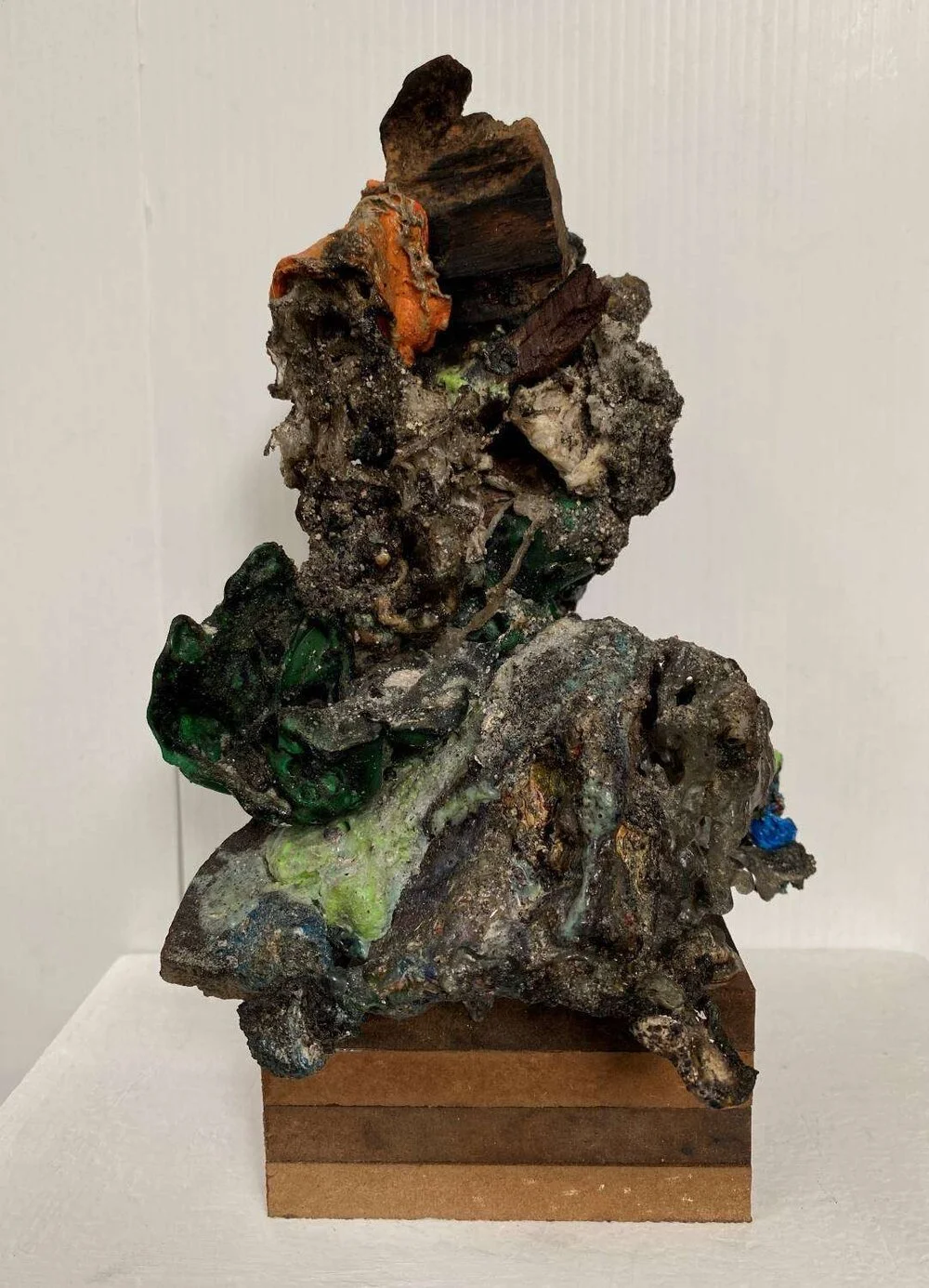 JC Jacinto, Forced Passage 3, 2020, molten plastic, natural and man-made detritus on wooden block. 22.9cm. Image courtesy of ArtInformal.