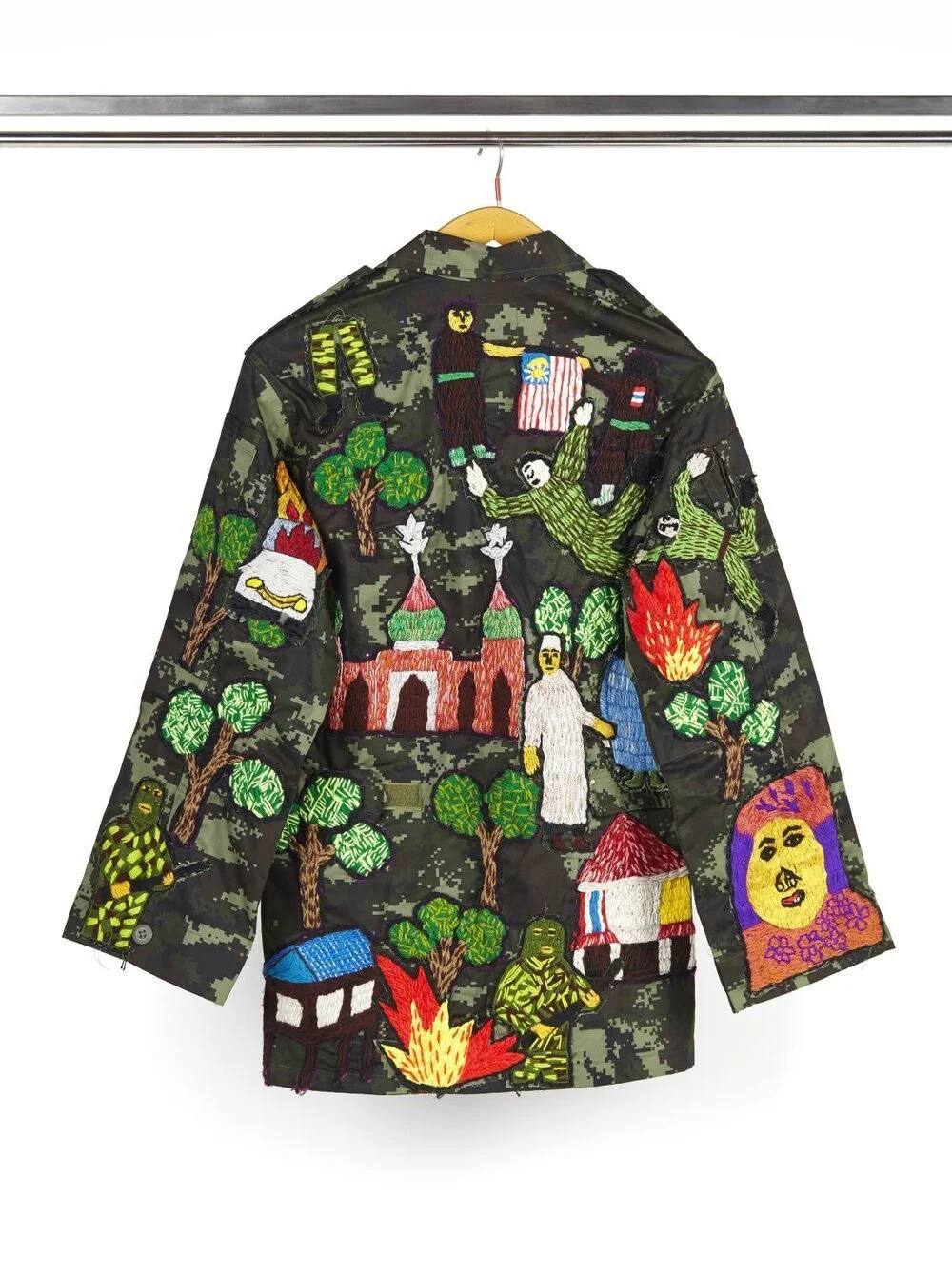 Jakkai continues his examination of repressed memory in Thailand’s deep South with his interactive work Changing Room (2017). He embroiders military jackets and songkoks (hats worn primarily by Muslim men in Southeast Asia) in a style that mimicks the children’s drawings he saw displayed in schools and government buildings while on a government-guided tour of the region, depicting naive visions of a peaceful South. Into this pastiche of innocence, Jakkai smuggles images of masked gunmen, burning mosques, and other references to the violence that still affects the region. He believes that the region is relying on the younger generation—many of them too young to have witnessed the worst of the violence—to lead them beyond the unrest. This can be seen as an attempt to achieve reconciliation by allowing memories of the south’s violent history to die with those who lived through it, both as perpetrators and as victims, to deal with the past not “by learning from history, but more like erasing history.”⁶