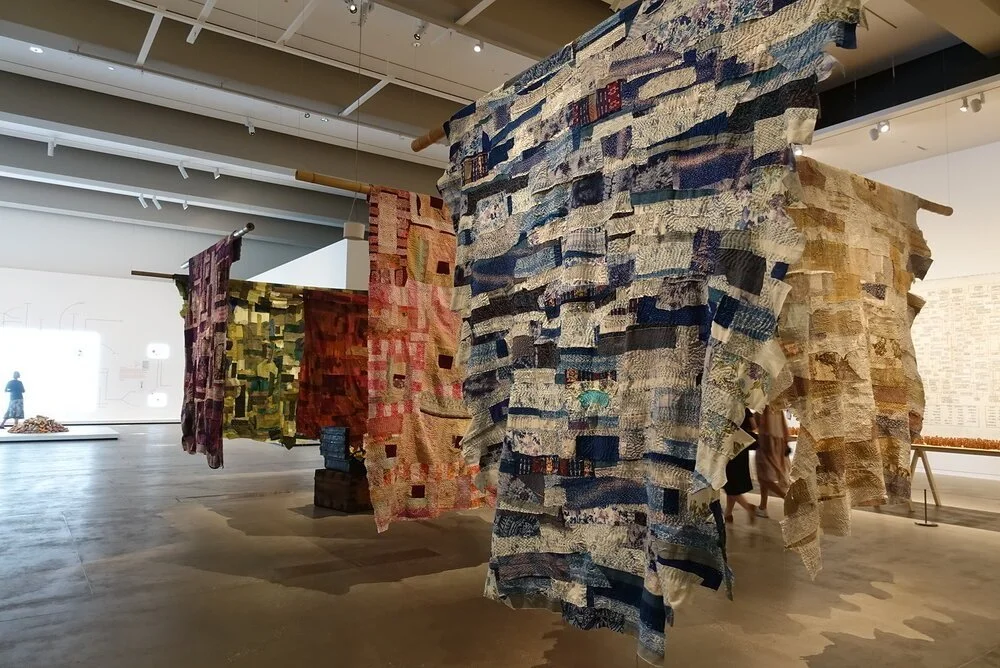 Jakkai Siributr, 18/28: The Singhaseni Tapestries, 2017-2018, cotton, silk, synthetic fabric, embroidery, found fabrics, disassembled garments, luggage trunks, sound. Collection of Queensland Art Gallery I Gallery of Modern Art.
