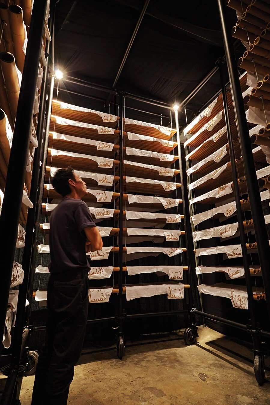 Jakkai’s memorial directly defies this suppression by replacing the gold-embroidered sacred text of the original Kiswah with the names of the 78 victims who died on the journey from Tak Bai. This is done with the notable exception of those who were never claimed and whose names are unknown. Behind his kiswah, Arabic for “funeral pall”, he has arranged a series of white tunics draped in rows across bamboo scaffolds, just as the “victims were ordered to lie on top of one another.”⁵ The tunics are numbered from 1 to 78, embroidered in the same Arabic-styled Thai script found on the outer tapestries.