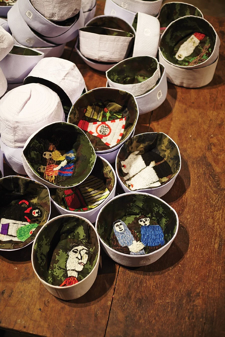 He emphasises this attempt to conceal southern Thailand’s recent traumas in the execution of the songkoks in his work. The outer lining of the songkoks are white, a color typically reserved as an honor for Muslim men who have already completed their pilgrimage to Mecca, but concealed inside each is a camouflaged lining and an embroidered image depicting the region’s hidden violence. These signifiers create dissonance, indicating on the outside that the wearer has already taken a difficult journey and arrived at their destination, while underneath unresolved violence still remains hidden from view.