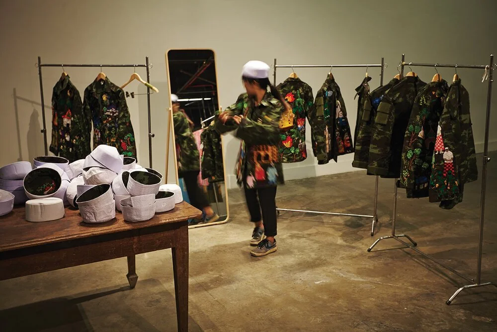 Jakkai Siributr, Changing Room, 2017, participatory clothing installation, embroidery on Thai military uniforms and Thai Muslim headgear. Image courtesy of the artist.