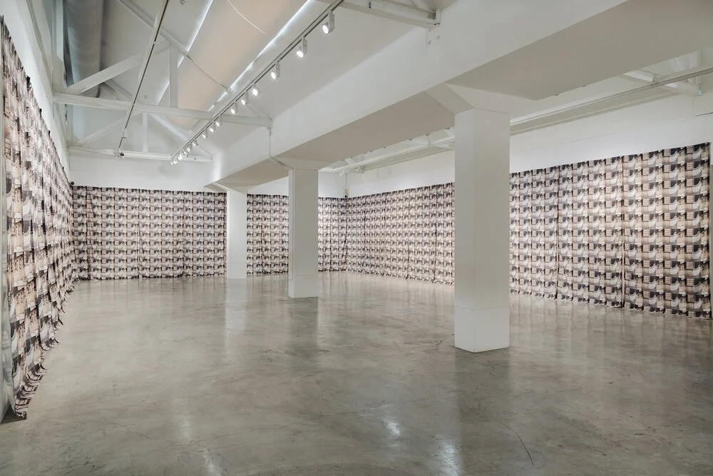 The Foreign Affairs series is presented in two forms: as canvas paintings, and a curtain which envelops the central gallery. In both iterations, Chong repeats the photograph until it covers the printed surface from edge to edge. The effect produced is deeply unnerving, as if putting the viewer in a paranoiac position of observing endless closed-circuit television screens. Chong describes them as “surfaces that hide other things”. The curtain installation also suggests an element of staging, with actors operating “behind the curtain”.