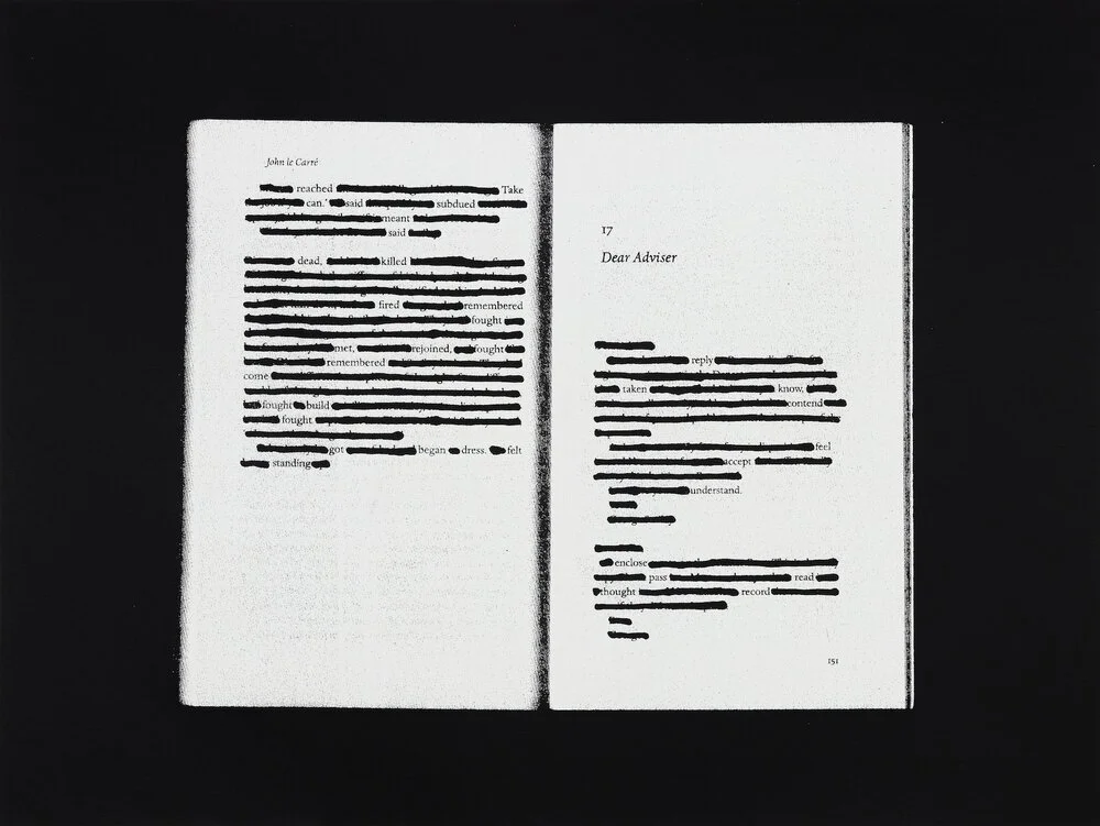 This ritualistic process is also evident in Call for the Dead (2020), a monumental 83-part work produced in collaboration with the STPI workshop. It features pages from John le Carreé’s spy novel from 1961 by the same name, with its text systematically redacted to only leave behind verbs. This arduous intervention renders the book illegible, thus shrouding the characters’ actions in secrecy. Without further cues about this choice of reference, my engagement with the piece is met with a dead end. Call of the Dead lacked the simplicity and conceptual elegance that made Chong’s other works effective. In this instance, the strategy of accumulation does not quite entail a sum greater than its parts.