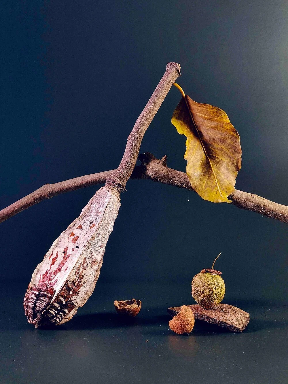Shot in his makeshift studio, photographs in this series are a continuation of State of Solitary (2020) which was also presented at the ArtScience Museum. Garden City seeks to show the life cycle of Singaporean plants. Sandwiched between brightly coloured creations, a single dark photograph stands out. It is composed of tree branches and leaves, with a dried seed pod set against a navy blue backdrop. Lim explains that this particular piece represents the eventual end that all life will come to before renewing again.