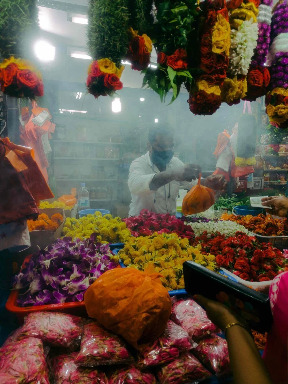 In the same way, Venus Oh’s Lumina series of portraits examines the lives of Singaporean people in isolation. Oh successfully captures her subjects in their natural environment, and transports us to moments in time and space where only her subjects exist. Departing from her usual fashion-focused work, Oh invites visitors to look towards their own states of mind through the vulnerability that Lumina demonstrates. In a particularly striking image, a flower seller is shrouded in smoke, and we see him interacting with his customer framed by the flower garlands he has made. This balanced juxtaposition invites me to pause and rethink what isolation can look—and feel—like. Oh, who is a filmmaker, has made the series come alive with a non-narrative video that brings to life the cityscape at night. Shot over the course of a single night, Oh’s unending video playing on loop intensifies the sense of solitude that comes through in her still photographs.