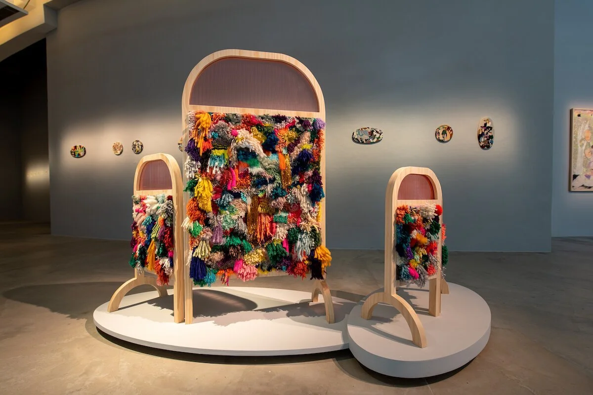 Building on Shankar’s practice of making emotional labour visible, Ginette Chittick’s works Echoes and This Must Be The Place shine a light on the invisible labour of women and their lived experiences. They consist of multiple Shogi screens, from which brightly coloured, cloud-like tufts of various sizes, textures, and materials, such as cotton from local Kapok trees, emerge. Reflecting her role as a mother, Chittick’s choice of furniture proves deliberate as it represents the domestic demarcation of the public and the private, thus recalling how a woman’s labour might go most unnoticed at home.