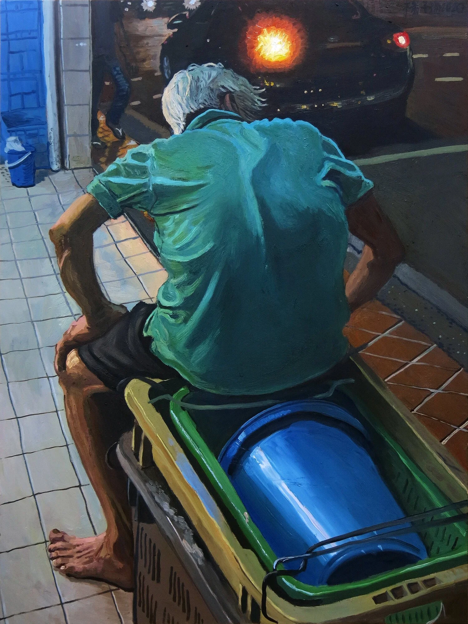 In contrast to the many street scenes, two vertical paintings close in on two figures that echo each other, both depicting the back of an older man. Man Waiting On The Platform (2020) evokes a sense of weariness, highlighted through the crinkles and folds of the subject’s shirt, his greying head slightly tilted towards the ground, two full bags clutched in his hands. Back of a Man (2020) shows a man seated precariously on the edge of plastic crates, looking off towards the street, the lines of his shoulders and back held tense in a body hardened by manual labour. Even without painting their faces or expressions, Yeo manages to imbue an immediate viscerality in both works. Looking at these paintings, I was struck by a sudden and deep empathy for these strangers, recognising that while our lives are different, most of us bear the same weight that comes with the mundanity of life in work, late nights and long commutes.