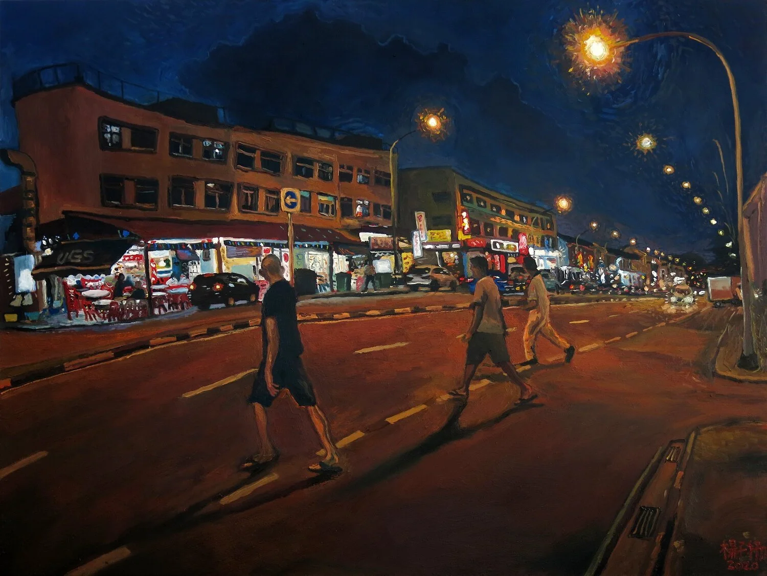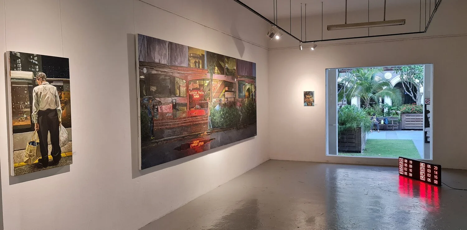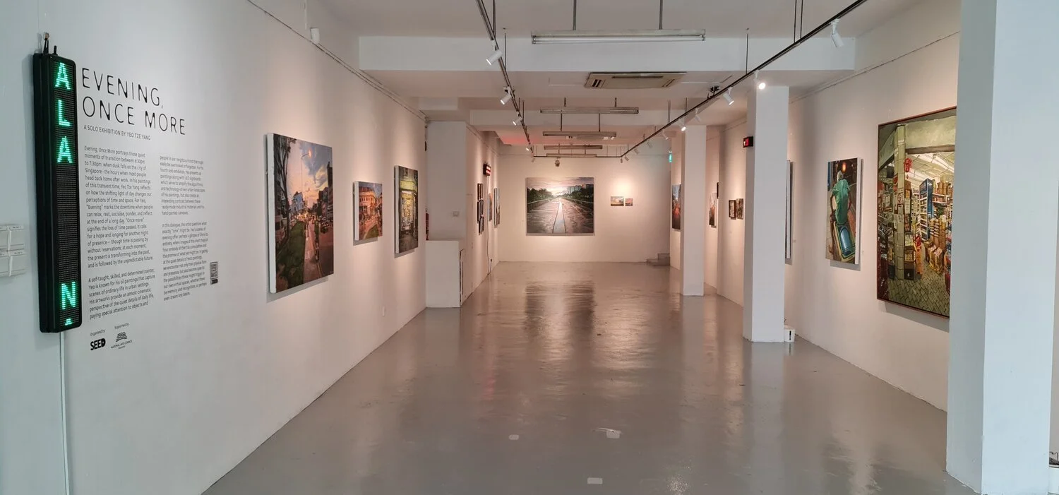 Presented in collaboration with SEED Art Space, Evening, Once More is the latest solo exhibition from Yeo Tze Yang, who is known for his detailed oil paintings which depict everyday scenes. Held at The Substation, the exhibition features works from 2020-2021, consisting mostly of oil paintings, with smaller sketches and LED sign board installations interspersed throughout. The title references Yeo’s 2017 exhibition, Evening at OUR ArtProjects, Kuala Lumpur, Malaysia, and is a continuation of his exploration into evening and night scenes, specifically the time of dusk between 6.30pm and 7.30pm.