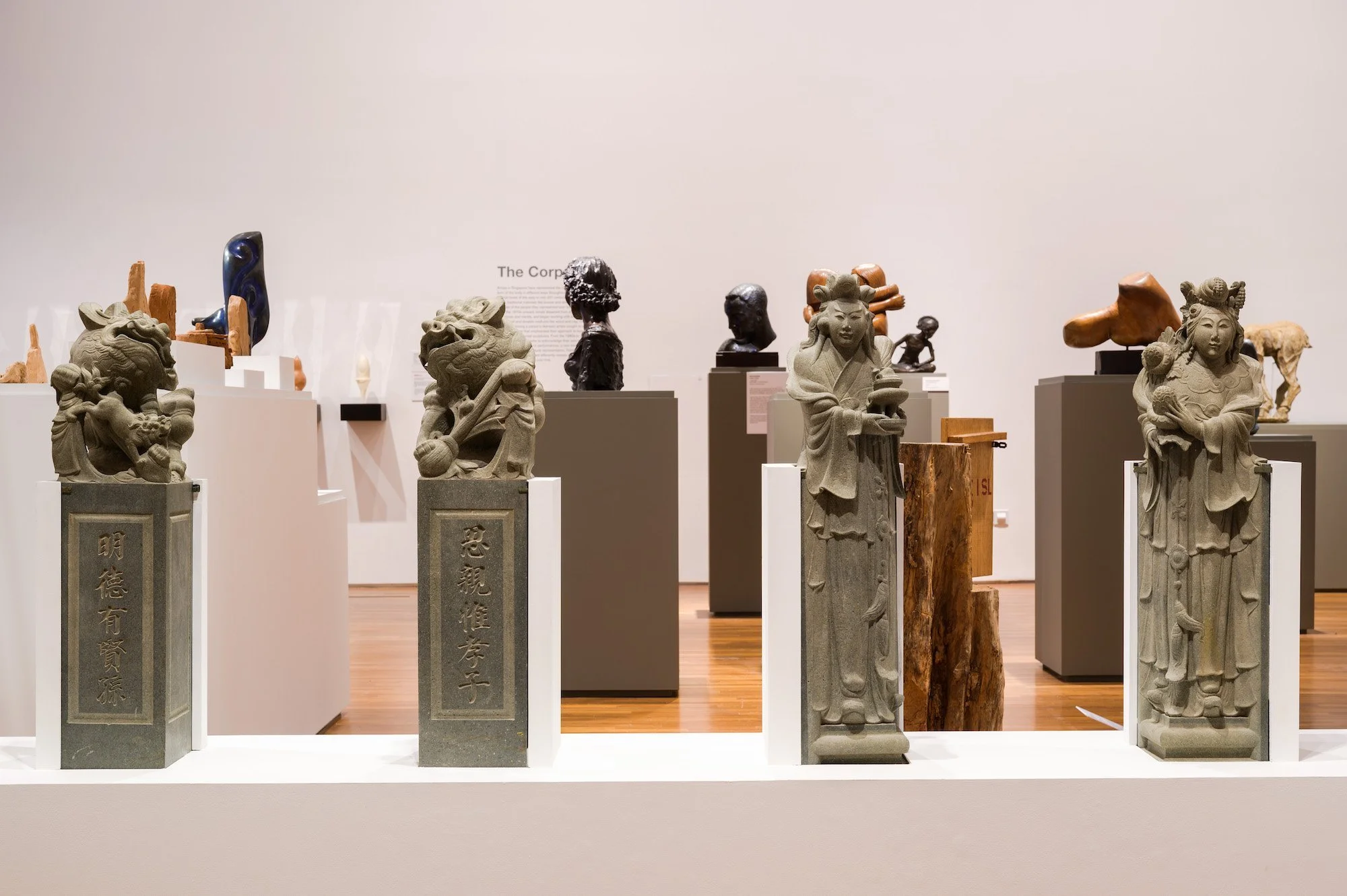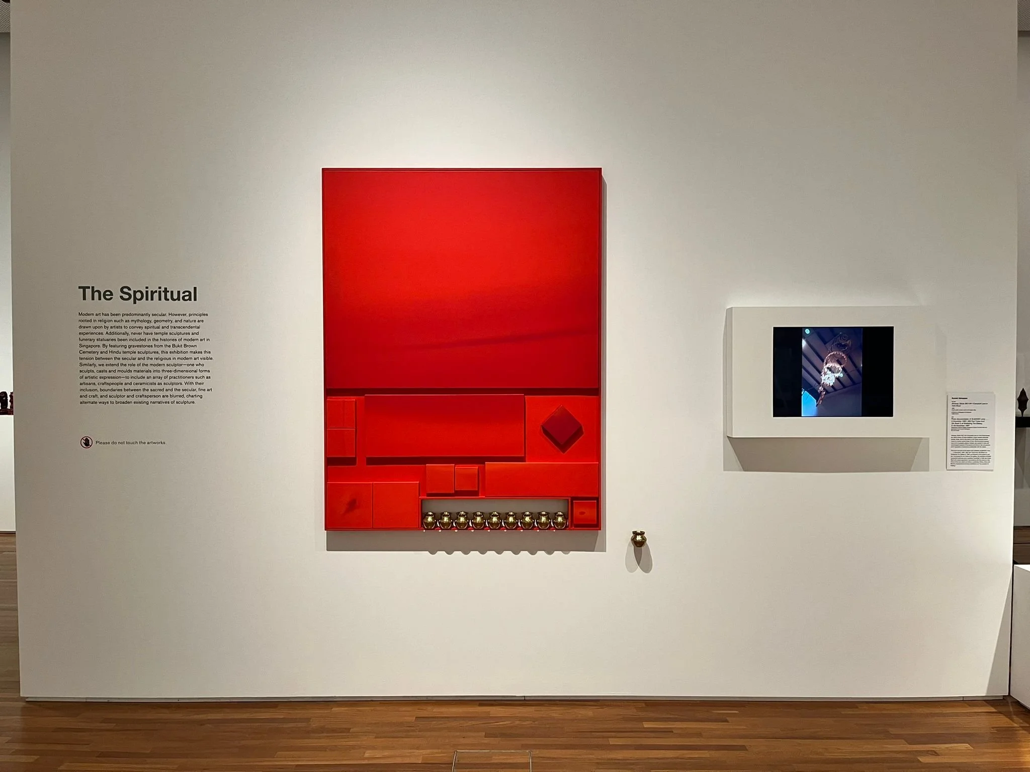 These two aspects come together in what the curators describe as an “open exhibition layout”, partly inspired by the storage systems used to house Singapore's national collections at the Heritage Conservation Centre. It is a novel mode of presentation that immediately sets a unique tone in the space. Temple figurines and funerary statuary are presented alongside works by modern and contemporary Singapore artists. The sheer number of objects packed into the gallery is also striking. There is just so much to see: a cacophony of materials and textures of different scales, displayed at different heights.