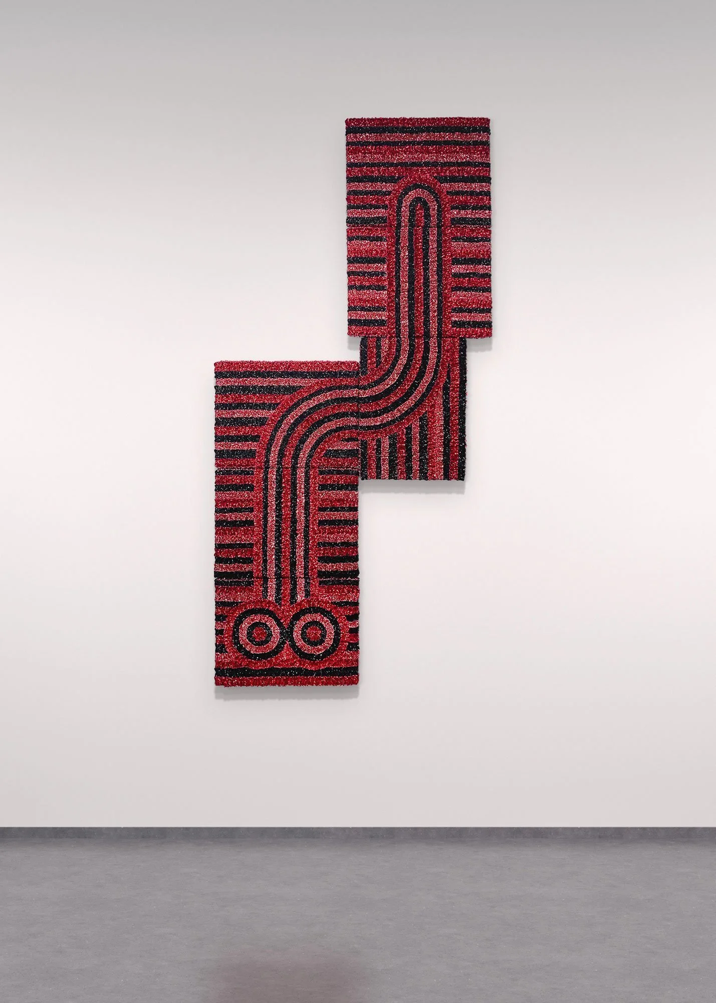 Through his work, Xun transfigures the rawness of his emotions and experiences into self-contained, decorative abstractions. In works such as Psycho Ornamental Ideal Boyfriend II and Maybe That’s What It’s Supposed to Feel Like, Xun blatantly gestures towards a romantic ideal while emphasising the artifice of these aspirations through his use of lush materials as well as mod-inspired geometric lines and shapes that contribute to the visual drama.