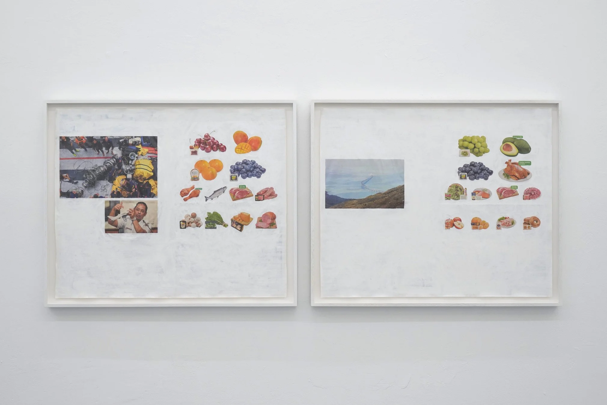 On one of the framed sheets of newspaper, Yu Tong carefully painted around photos of produce, cheeses, meats and fish, his brush hugging the curves of lush mangoes, fatty bacon, and a glistening roast chicken, to name a few. On another: a cluster of people around an engine part the size of a man, and a man pointing at a model of an airplane. Yet another: a bridge arcing out into the sea, reaching a vanishing point in the hazy blue horizon. You squinted. We couldn’t see what is on the other side. We had no context for any of the images – except, perhaps the groceries, which are clearly from an advertisement of sorts. I return to them. The drumsticks, the advertisement proclaims, are EXCLUSIVE. The chicken is FRESHLY ROASTED IN STORE. “Supermarket,” you said, examining them. “Singapore doesn’t grow food, right?”