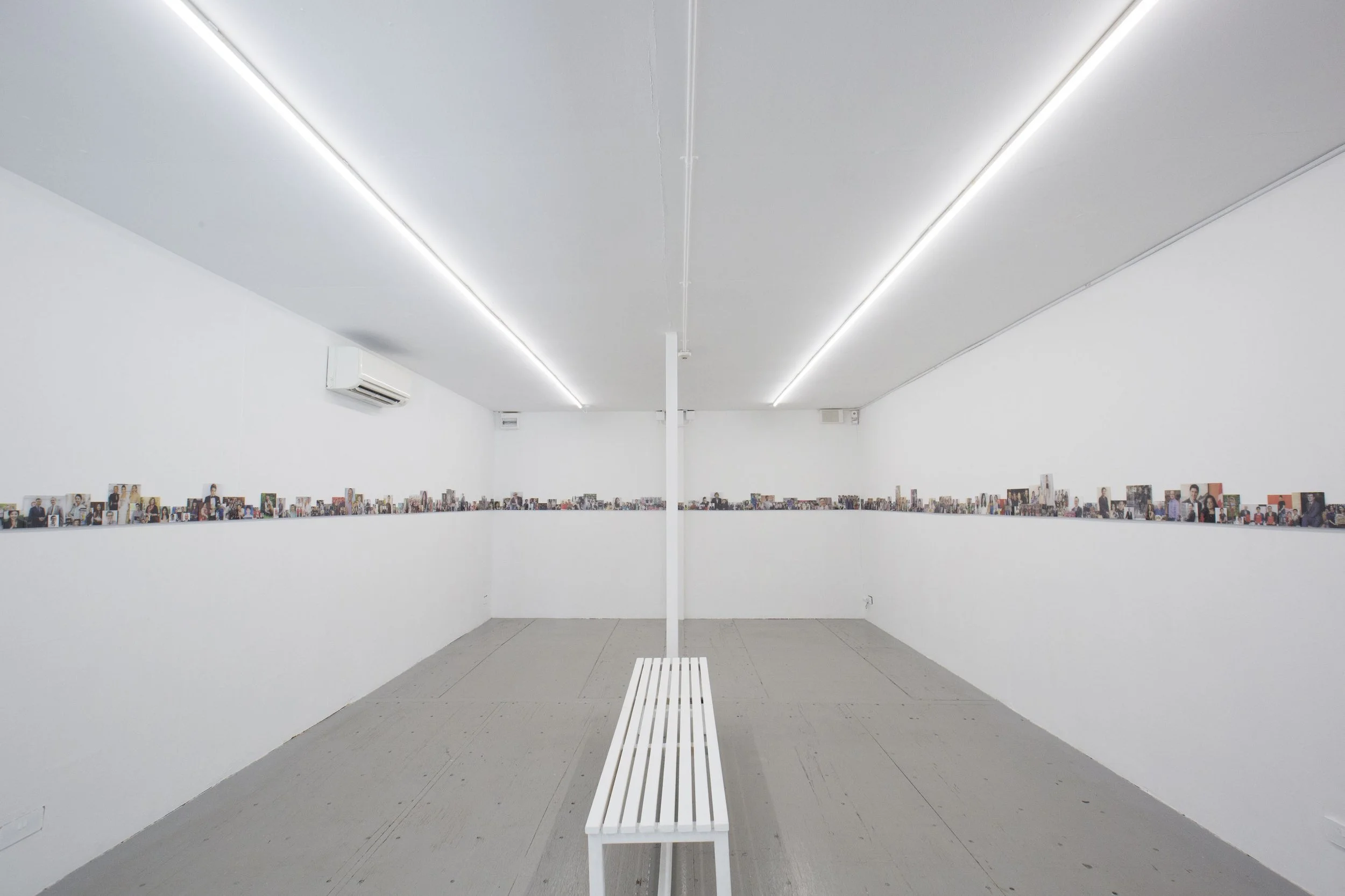 Gallery 2. Mostly empty. The white walls hold a single shelf, at about eye-level. The shelf holds photos of people smiling—350 in total—snipped from the newspapers. The largest is the size of a palm, and the smallest, the size of a thumb. They’ve been scanned and reproduced from paper then printed on clear acrylic blocks, arranged on the shelf to encircle the space. Despite my hope otherwise, you look unimpressed. “So many fake smiles,” you say. “Doctors and chefs and lawyers and athletes.” We sit in the middle of the room on the unvarnished wooden bench, a planet orbited by the ring of glazed faces.