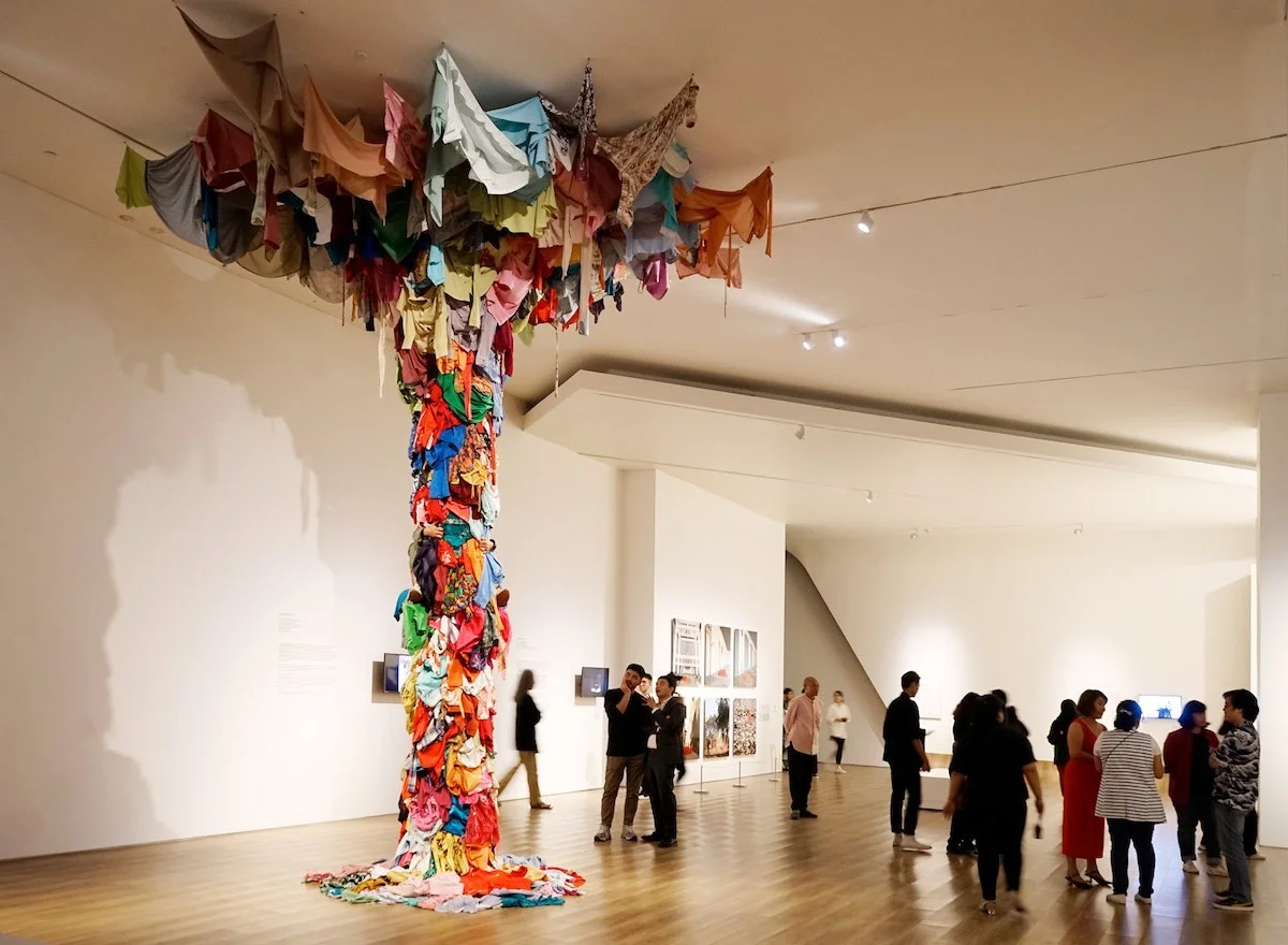 Turning our backs, we now face a tree made of clothes in Kleidungsaffe (2006) which means “clothes ape” in German, a critique against the mass-manufacturing fashion world. As we move from villages to cities, we are now expected to climb the tree, buying more expensive clothes to suit our social status and our desire to belong.