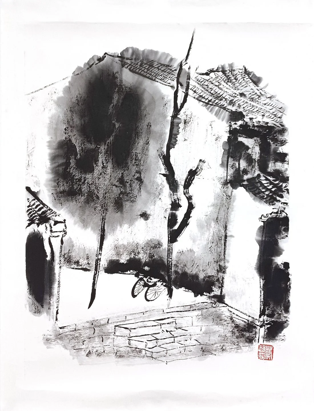 Chua Ek Kay, Bicycle by the House or 屋旁脚踏车, undated, ink on rice paper, 38 x 52cm. Image courtesy of Gajah Gallery.