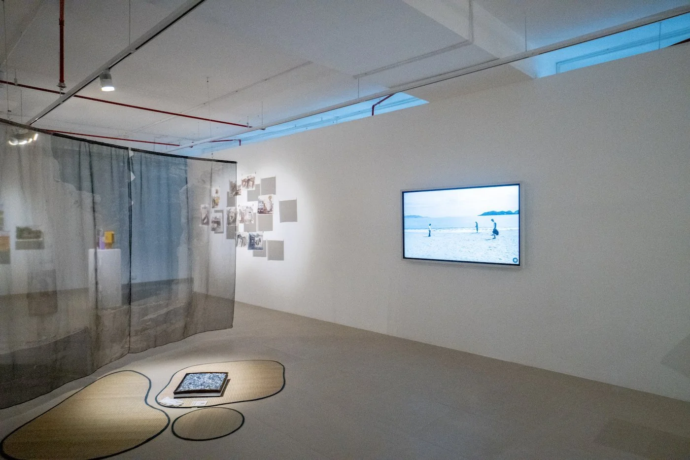 Đào Tùng’s A Game or We Were Born to be Loser (2022) imagines a rather metaphoric and childish version of this relocating system, where the fate of the people become subject to arbitrariness and snap decisions. The video shows footages of people playing a game called Majority Wins on an unnamed beach. Each round sees a loser or two blatantly stepping away from the group and swimming away to the horizon, with new players entering the game in turn. At any spot in the gallery space, one does not quite escape the sound of water waves crashing onto the shore, ominously radiating from the video art, threatening to wash away the people’s stories.